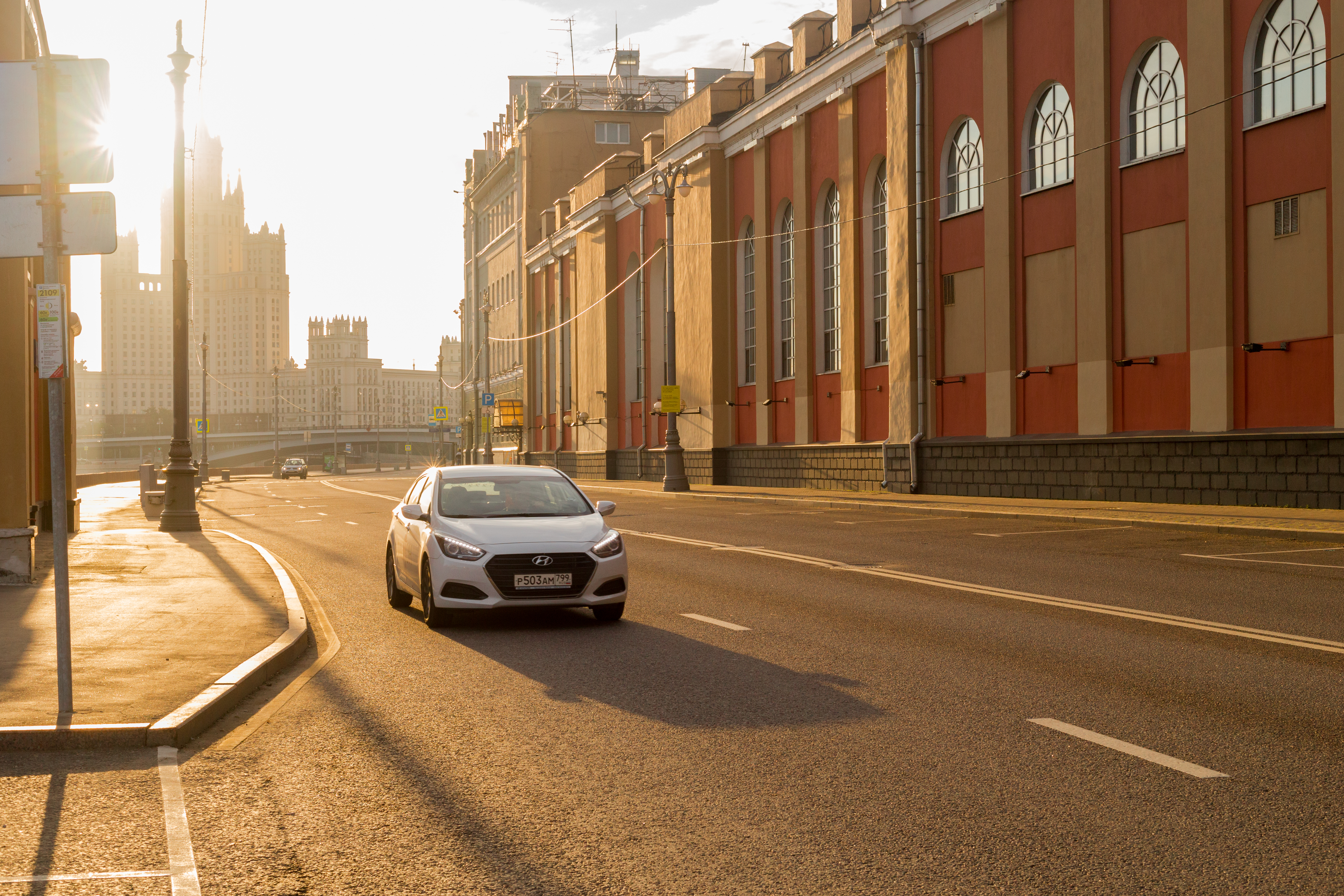 В утренние часы солнышко находится достаточно низко над горизонтом, что позволяет добиться длинных и выразительных теней и хорошо подчеркнуть объём. Снимок получился атмосферный, с настроением, свет очень красиво заполняет всё пространство кадра. Выгодно смотрится и автомобиль на переднем плане, оживляя сюжет. Свет является главным фактором в фотографии. Можно ещё сказать, что свет – сердце фотографии. Фотоаппарат не видит изображения. Для него не существует ни линий, ни форм, ни фактуры. Плёнка или цифровой сенсор восприимчивы только к потоку фотонов большей или меньшей интенсивности, спроецированному на них объективом.Представленный сюжет ещё интересен благодаря использованию в кадре линий и ритму.