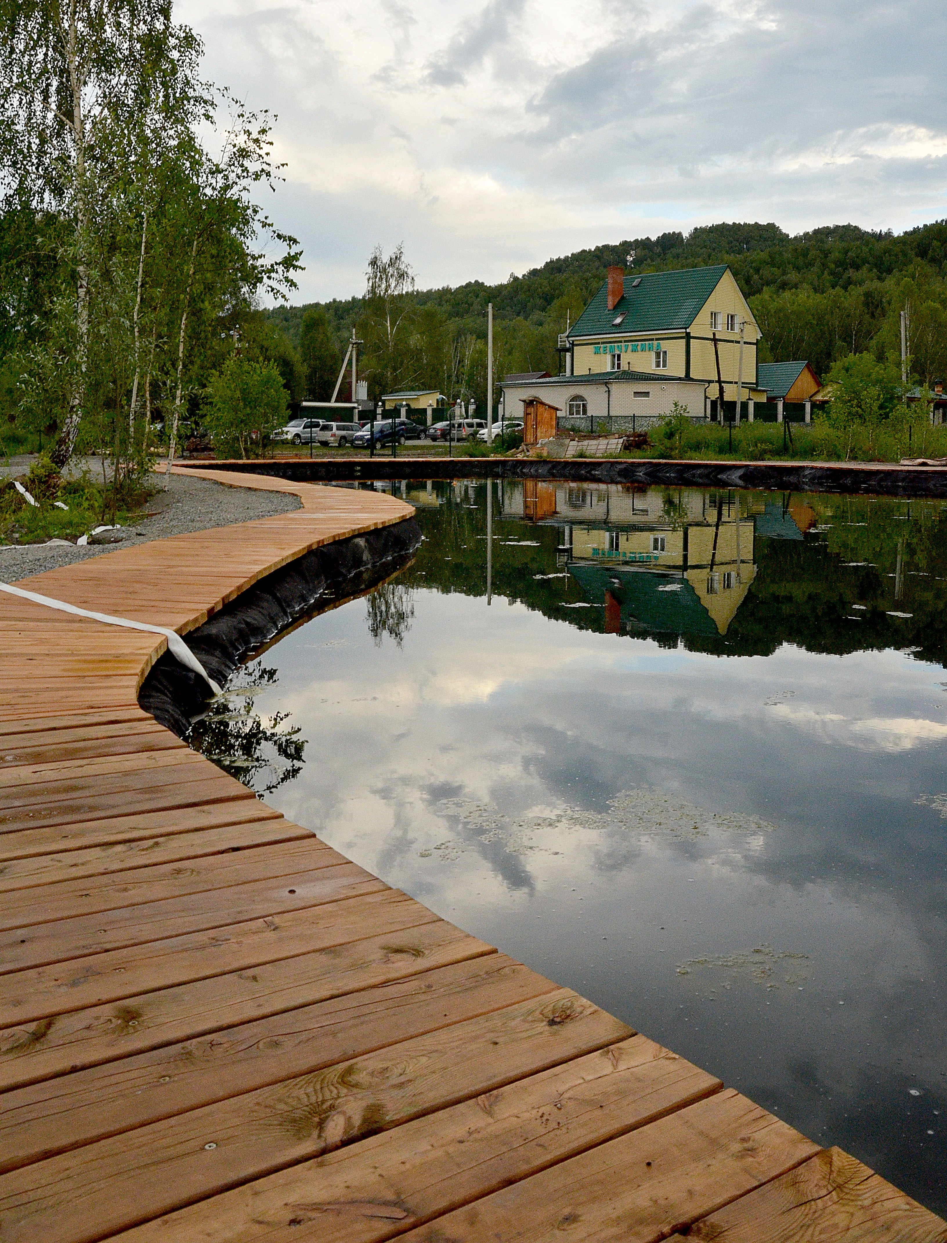 Хороший кадр. Дорожка создает эффектную, динамичную кривую, которая уходит в перспективу. Дощатый настил создает ритм в кадре. Хорошо обыграно отражение. Композиционно кадр так же неплохо вписан.