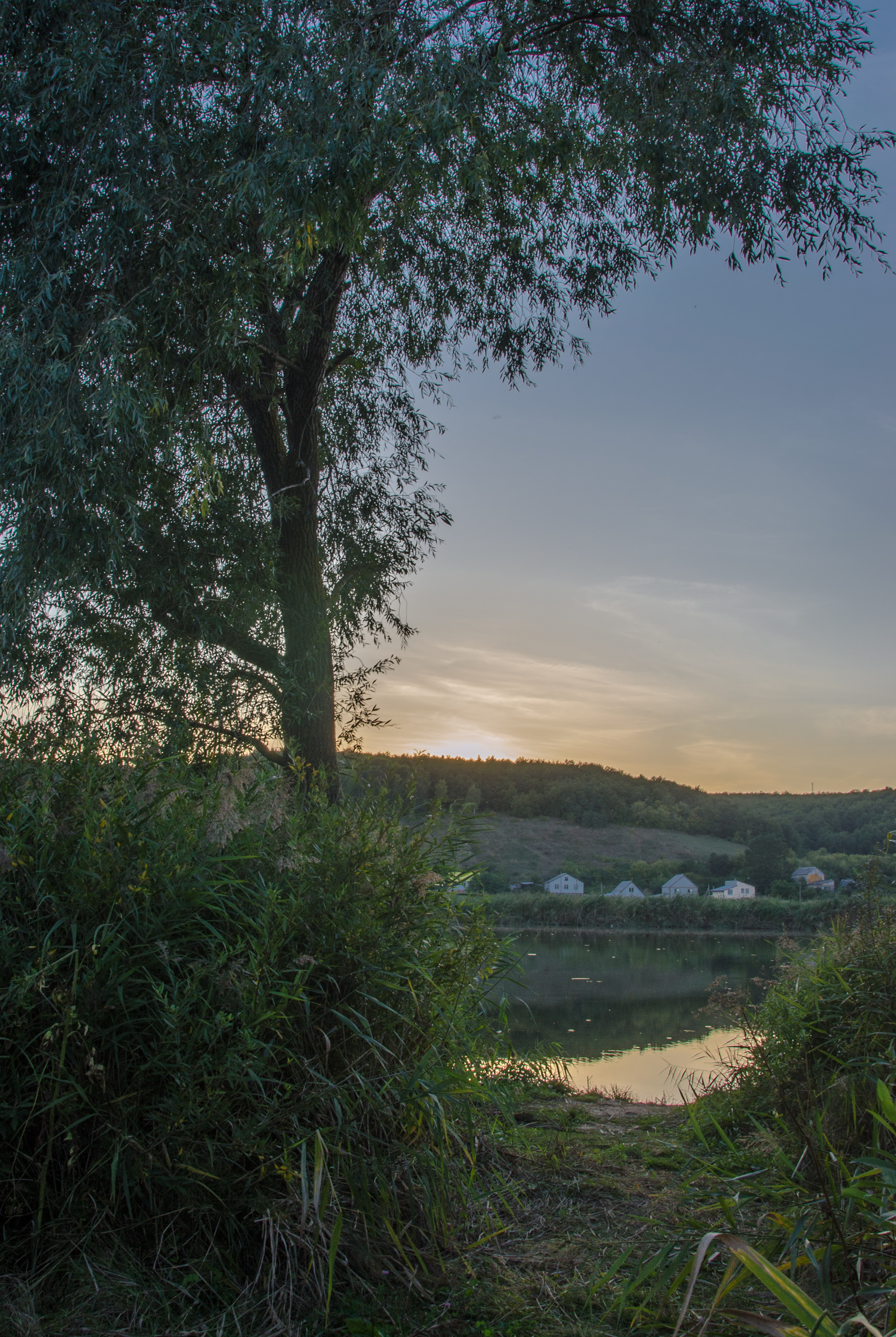 заход солнца.передний край образует кусты камыша, солнце скрылось за стоящим деревом и не пересвечивает кадр.вечер спокойный и теплый, вода кажется зеркалом.
