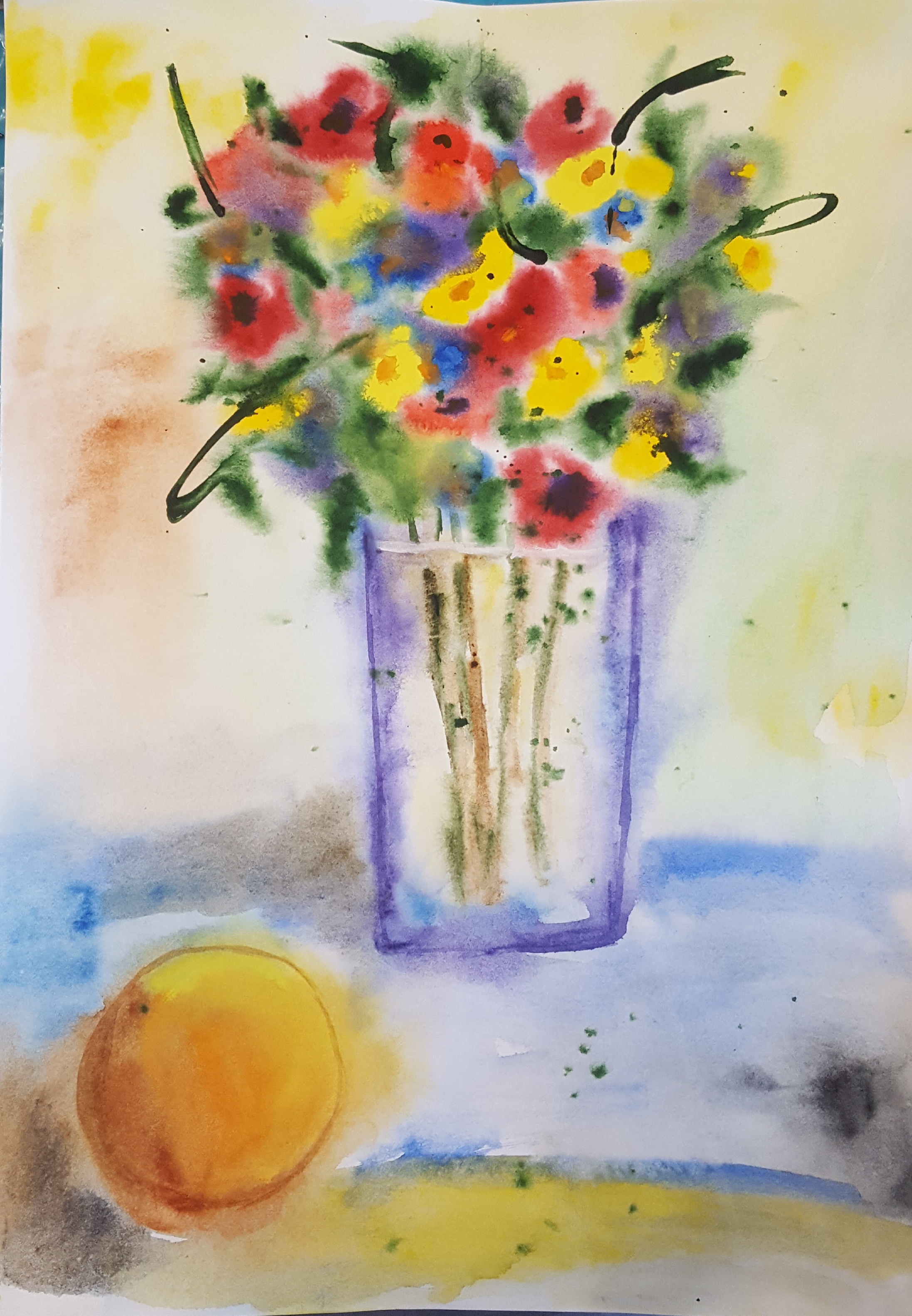 Во-первых, контуры вокруг вазы и апельсина немного уплощают работу. Лучше было бы решить этот вопрос сохранения формы предмета не довольно равномерной линией, а более живыми мазками (разными по форме и размеру) по более подсохшей бумаге.