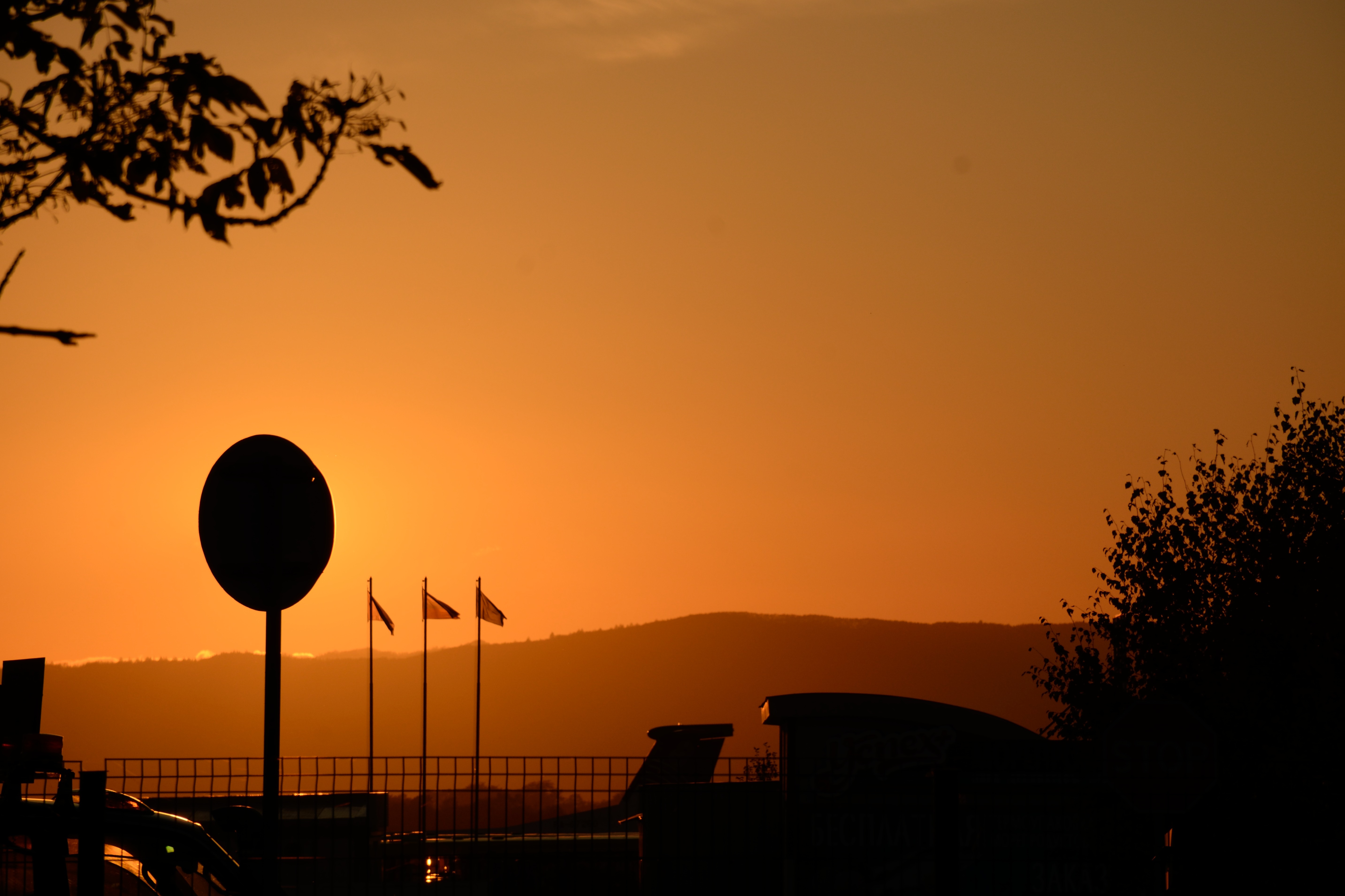 Хороший снимок с силуэтами! У фотографии получился выразительный цвет за счет ручного баланса белого. Удалось передать атмосфера вечера и заката. За счет гор и деревьев есть тональная перспектива и разноплановость в снимке. Флаги задают ритм. Подобраны корректные параметры.