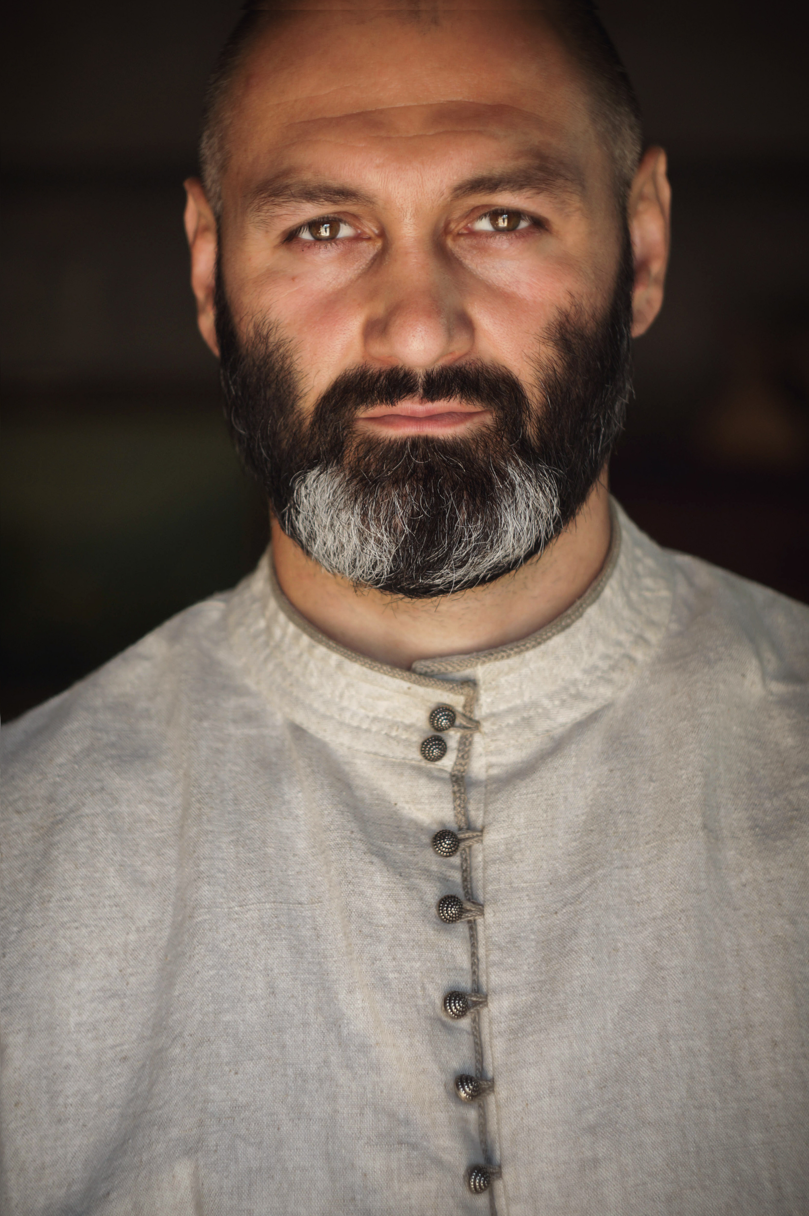 Освещение равномерное, портрет получился в светлых тонах, легкими тенями прорисован образ мужчины.