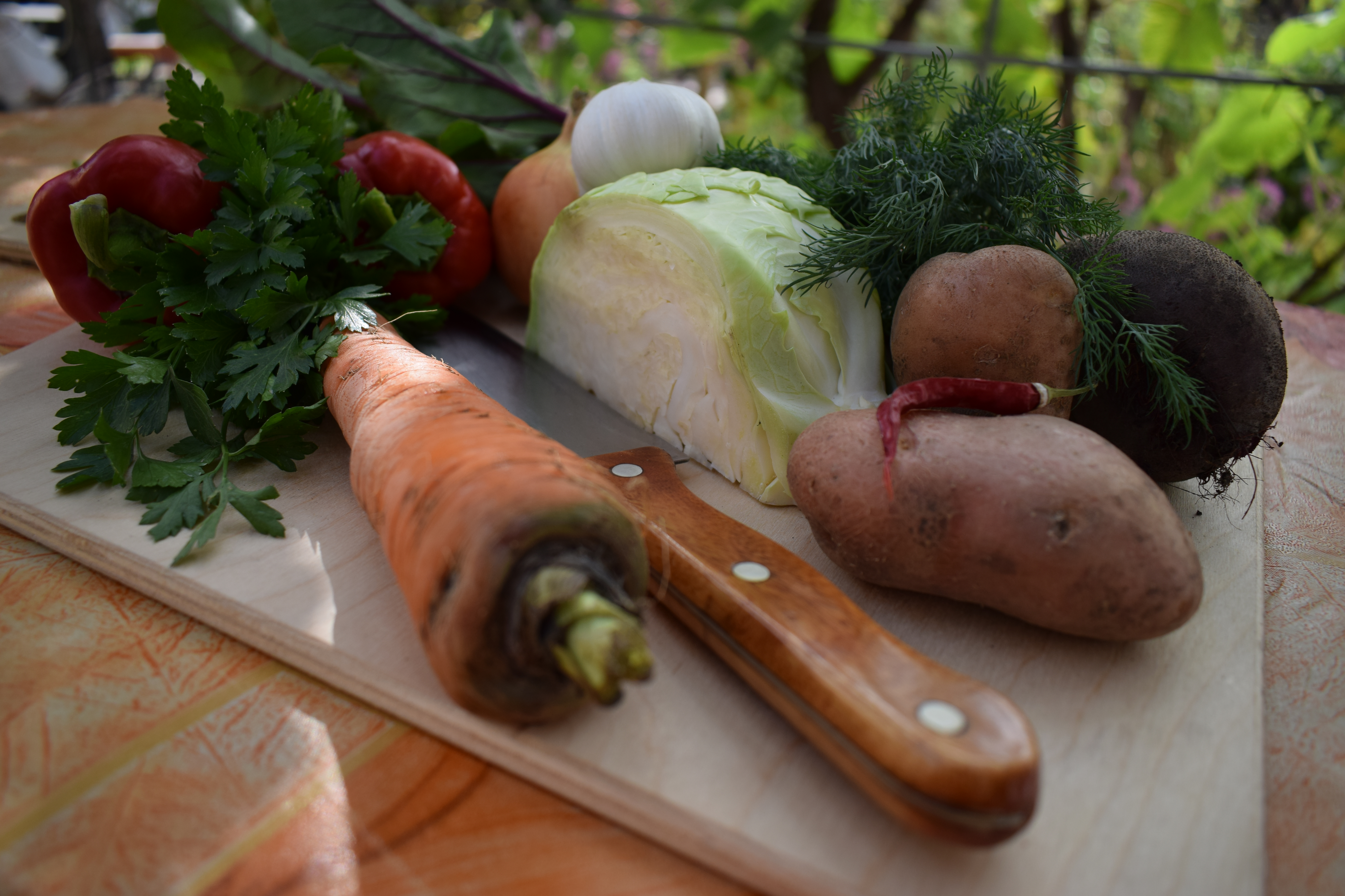 Одной из самых известных кулинарных визитных карточек русской кухни, конечно же, является борщ. Несмотря на обилие нюансов рецептур, основные ингредиенты неизменны и легко ассоциируемы на подсознательном уровне. Мне кажется, что глядя на этот натюрморт любая хозяйка точно знает что нужно делать далее, взяв в руки нож.