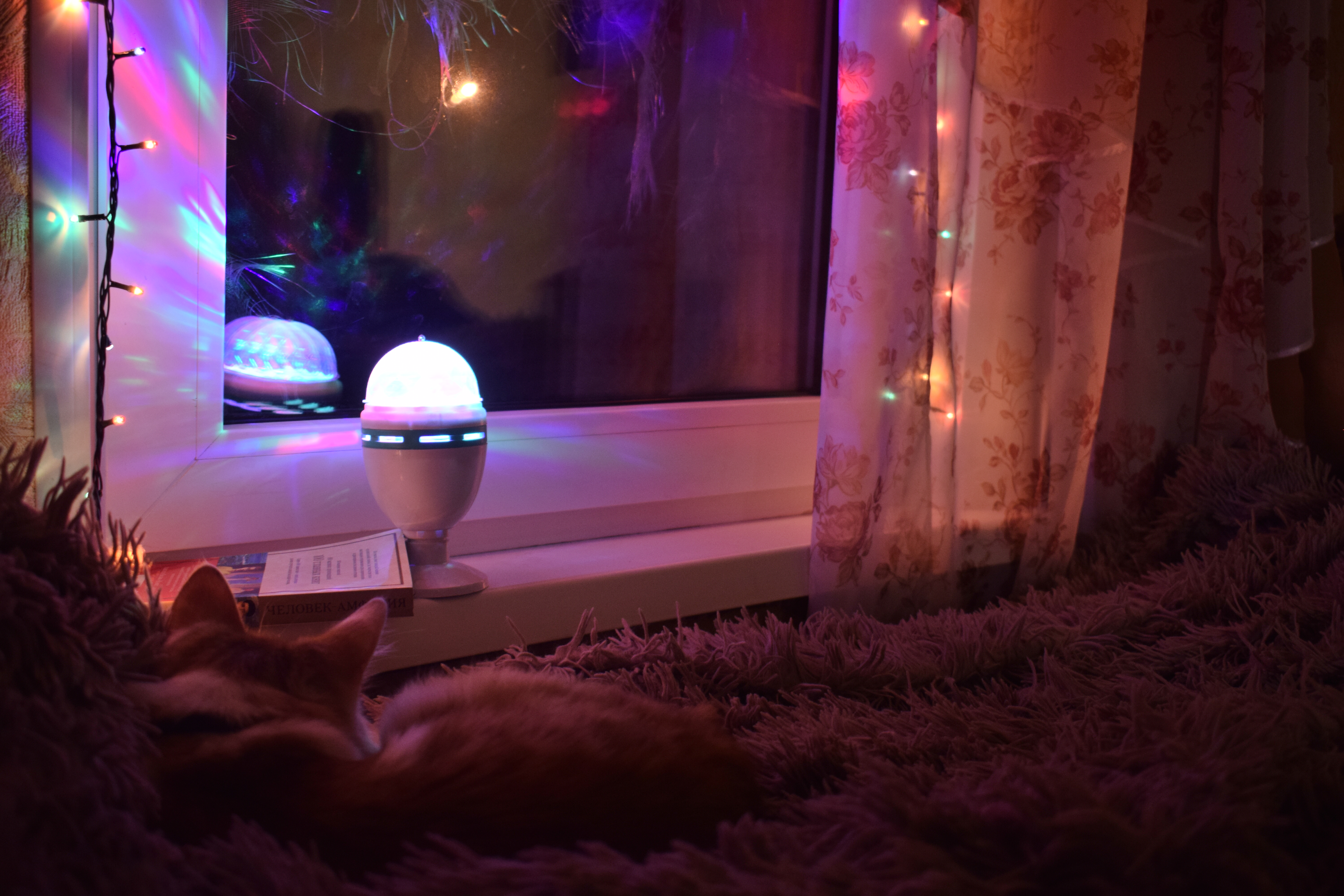 Переделала работу, стараясь учитывать прошлые ошибки, навела фокус на светильник, кот остался вне его, не знаю, стоило ли так делать. Немного осветлила фото с помощью D-Lightning'а в меню обработки камеры.