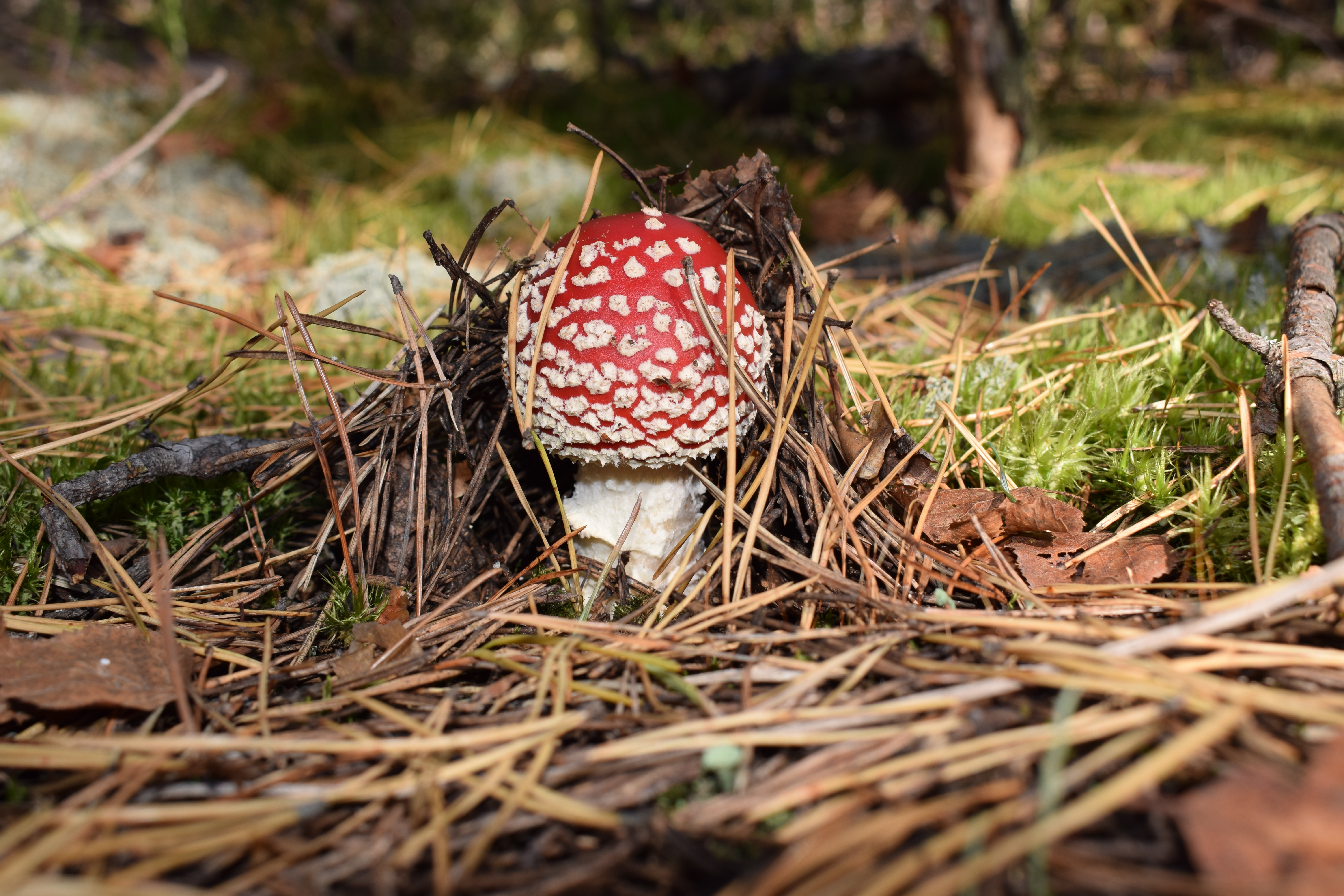Яркая шляпка здорово выделяет гриб.