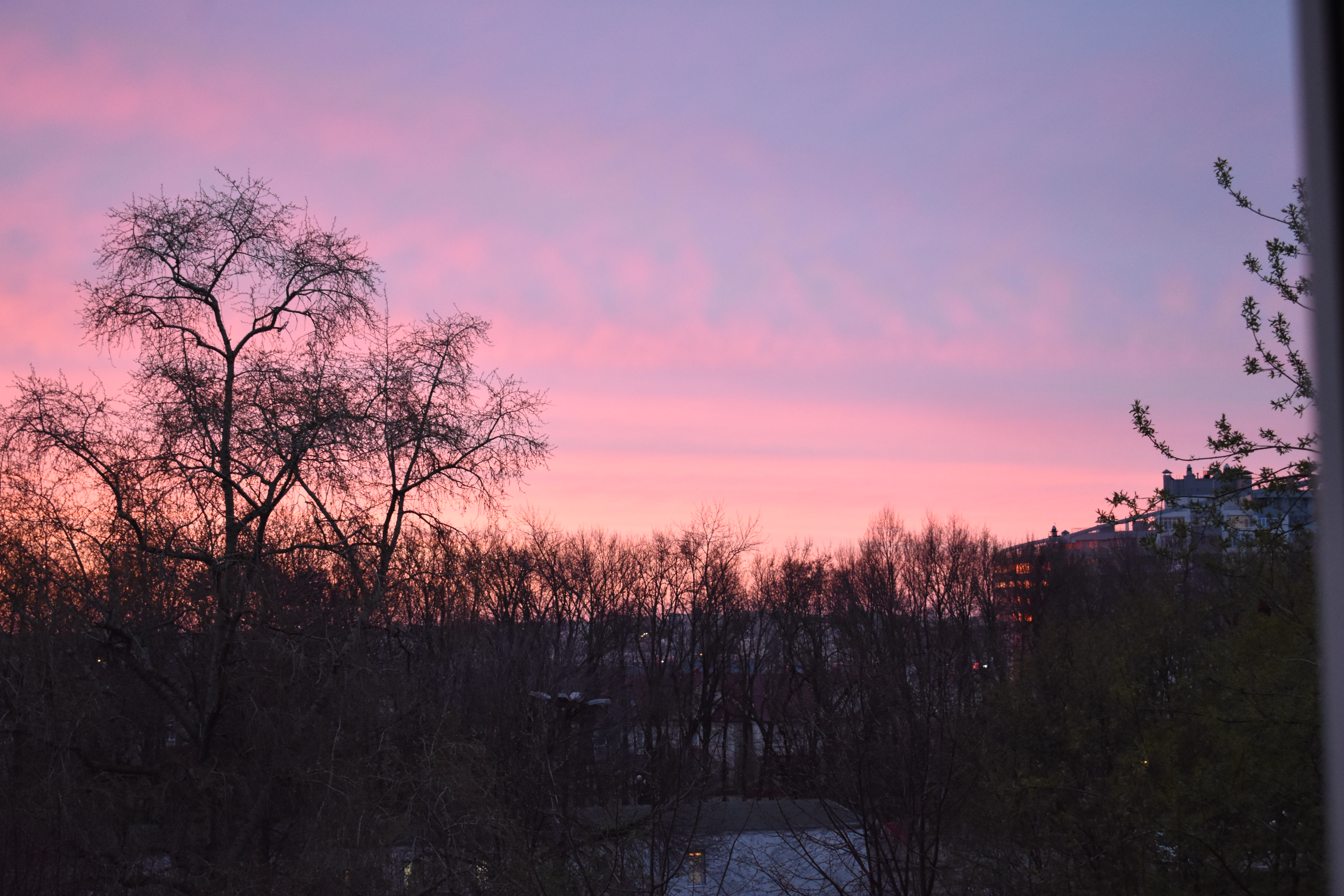 Силуэты веточек , деревьев здорово выделяются на фоне яркого неба. Снимок лаконичный и выразительный.