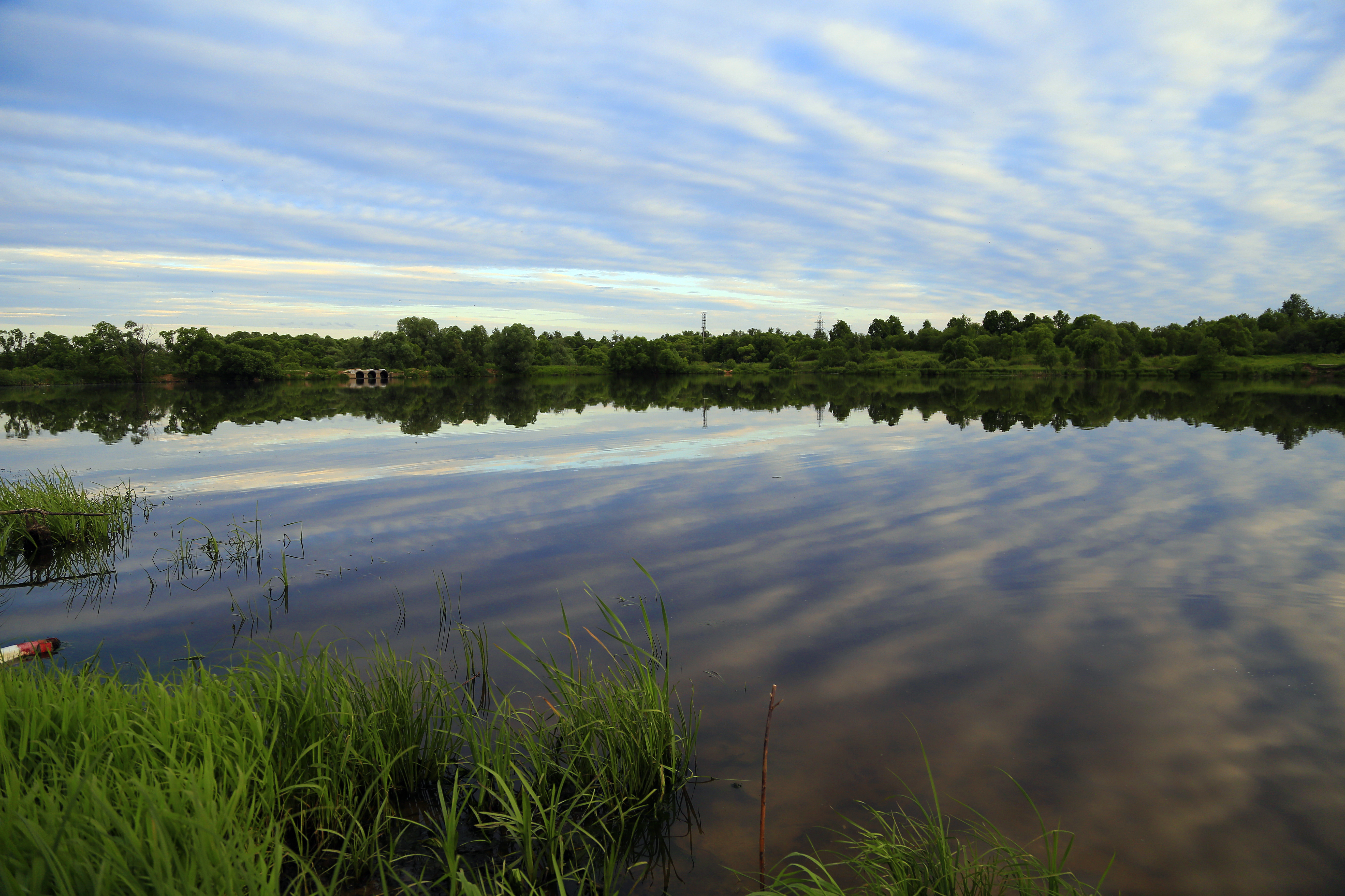 Красивый вид! Выбрали удачно время для снимка. Очень красивое небо, с ритмичным повторением облаков. Освещение очень мягкое от заходящего солнца. Выбран хороший ракурс - зеркальная поверхность воды идеально отражает небо и кромку дальнего берега, добавляя воздуха и усиливая перспективу в кадре. Трава на переднем плане добавляет передний план.