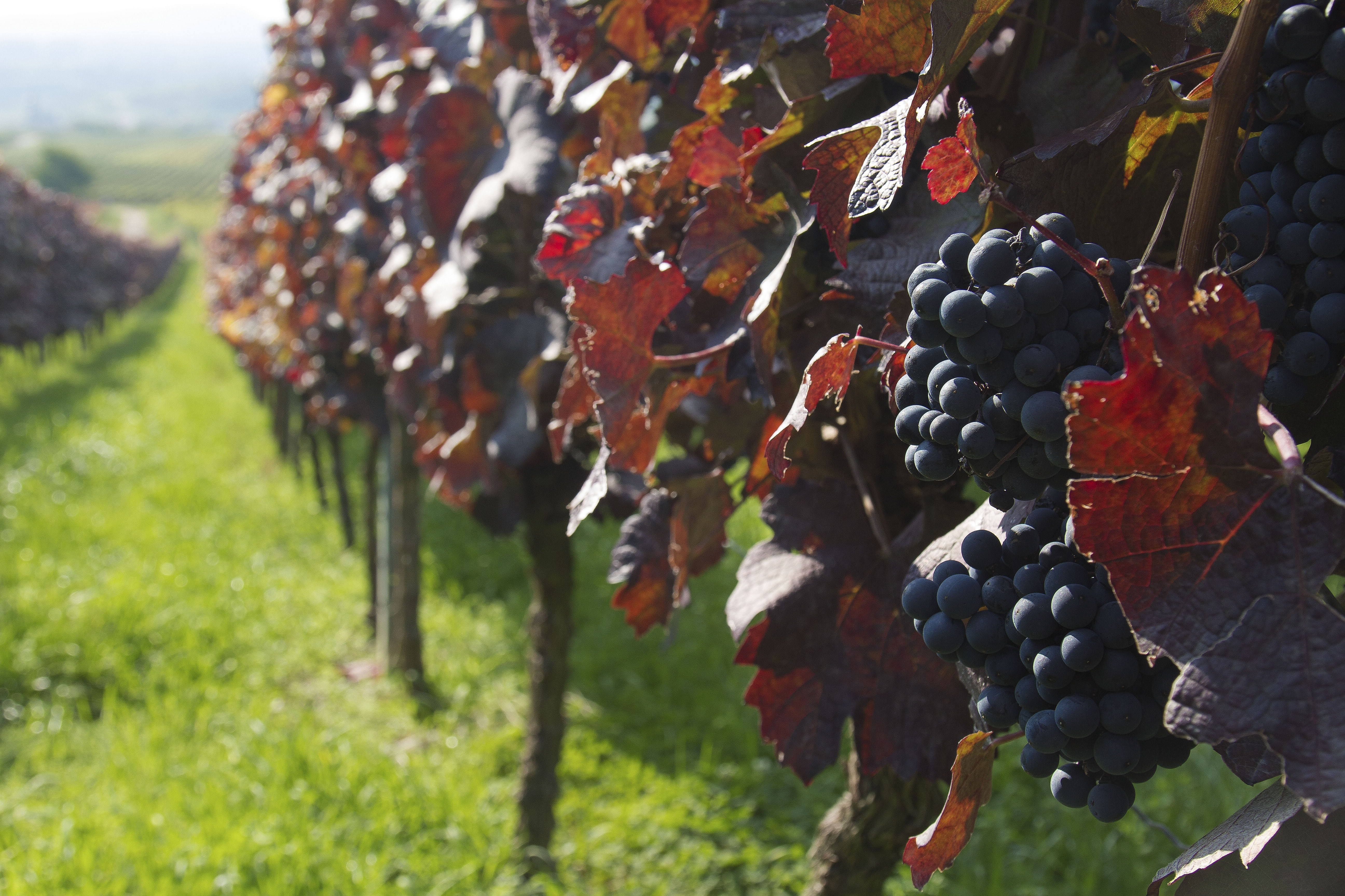 Удачно использовали линии посадки винограда для усиления ощущение глубины в кадре. Гроздь на переднем плане хорошо привлекает внимание, сфокусировались точно.