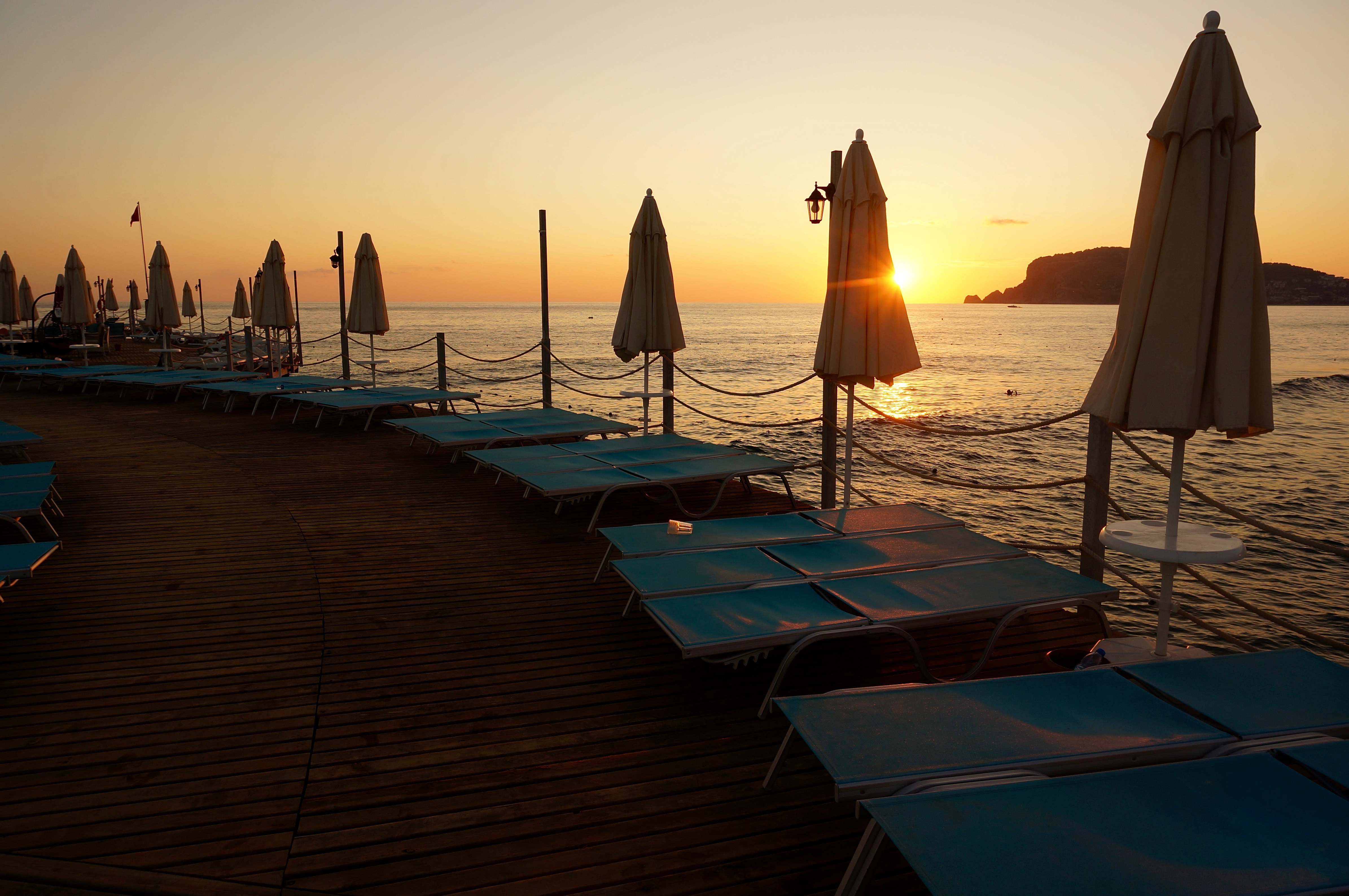 На закате сфотографировал зонтики с лежаками, использовал правило третий. На закате всегда сложно придумать, куда и насколько спрятать солнце. Ритм не идеален, но вроде есть)