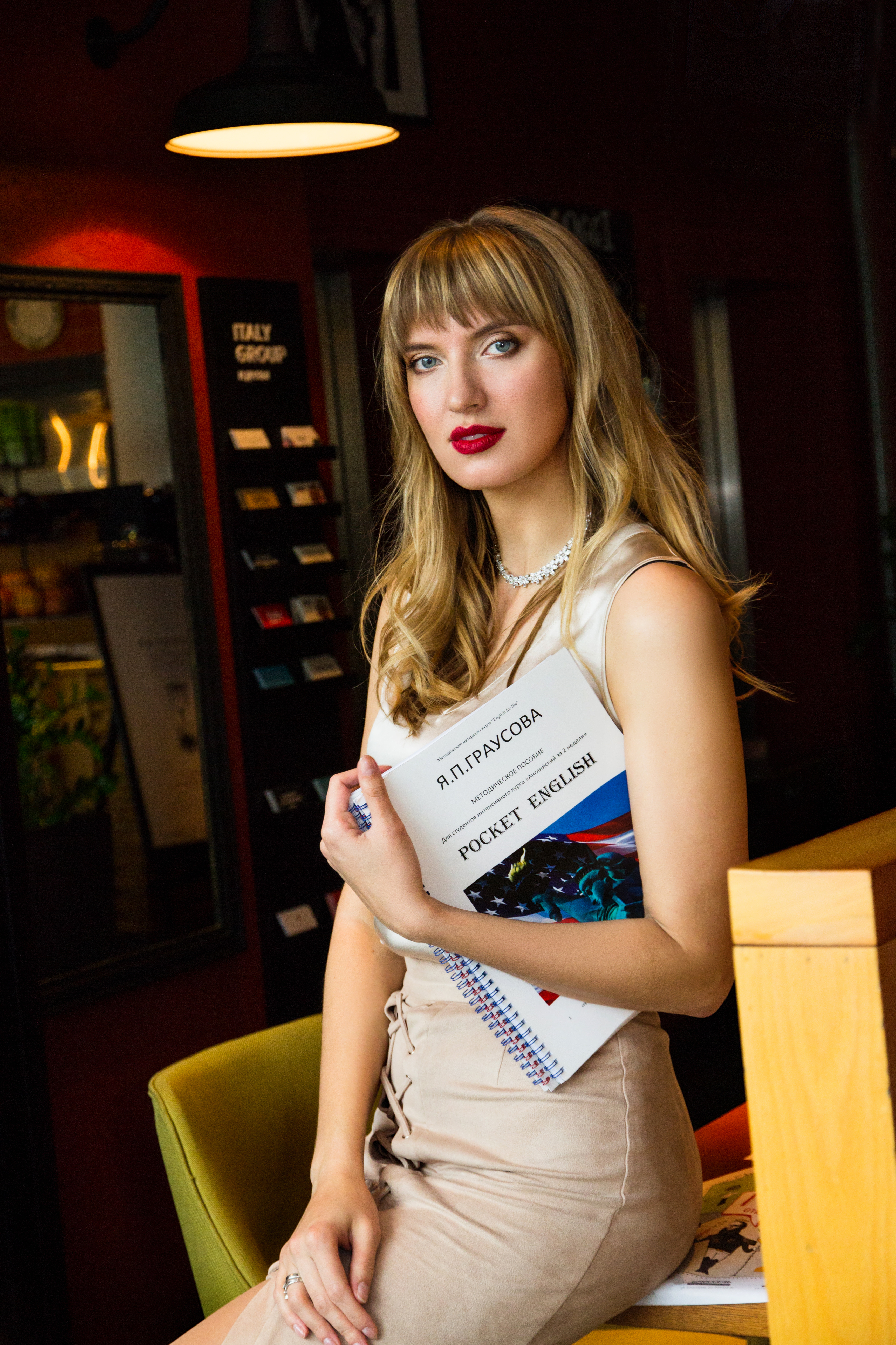 Девушка держит книгу легко , свободно . Линия руки усиливает на книге внимание.