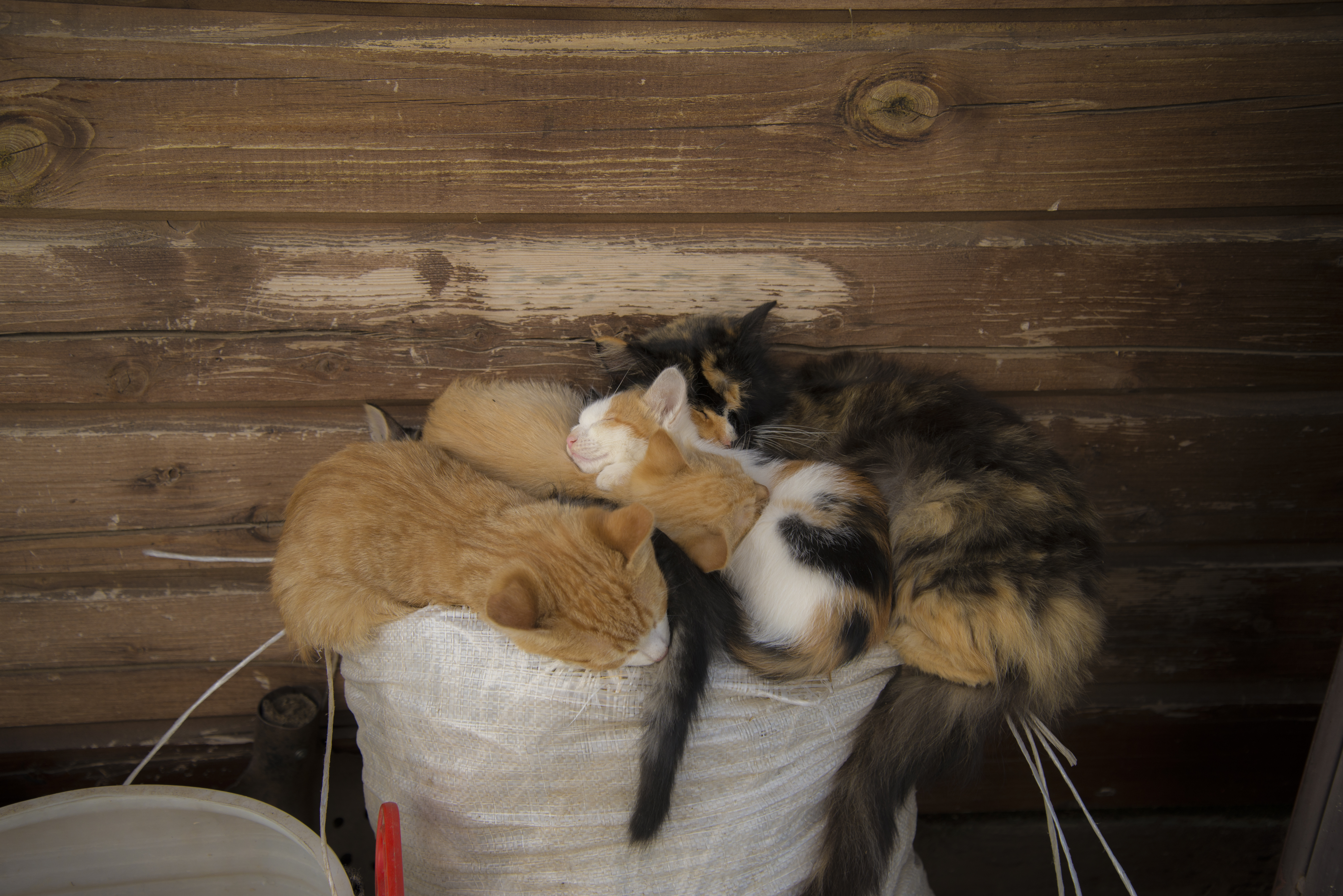 По композиции можно было крупнее показать все семейство, подрезав немного нижнюю часть кадра, в которой торчат фрагменты ведра, красная ручка, отвлекающие внимание.