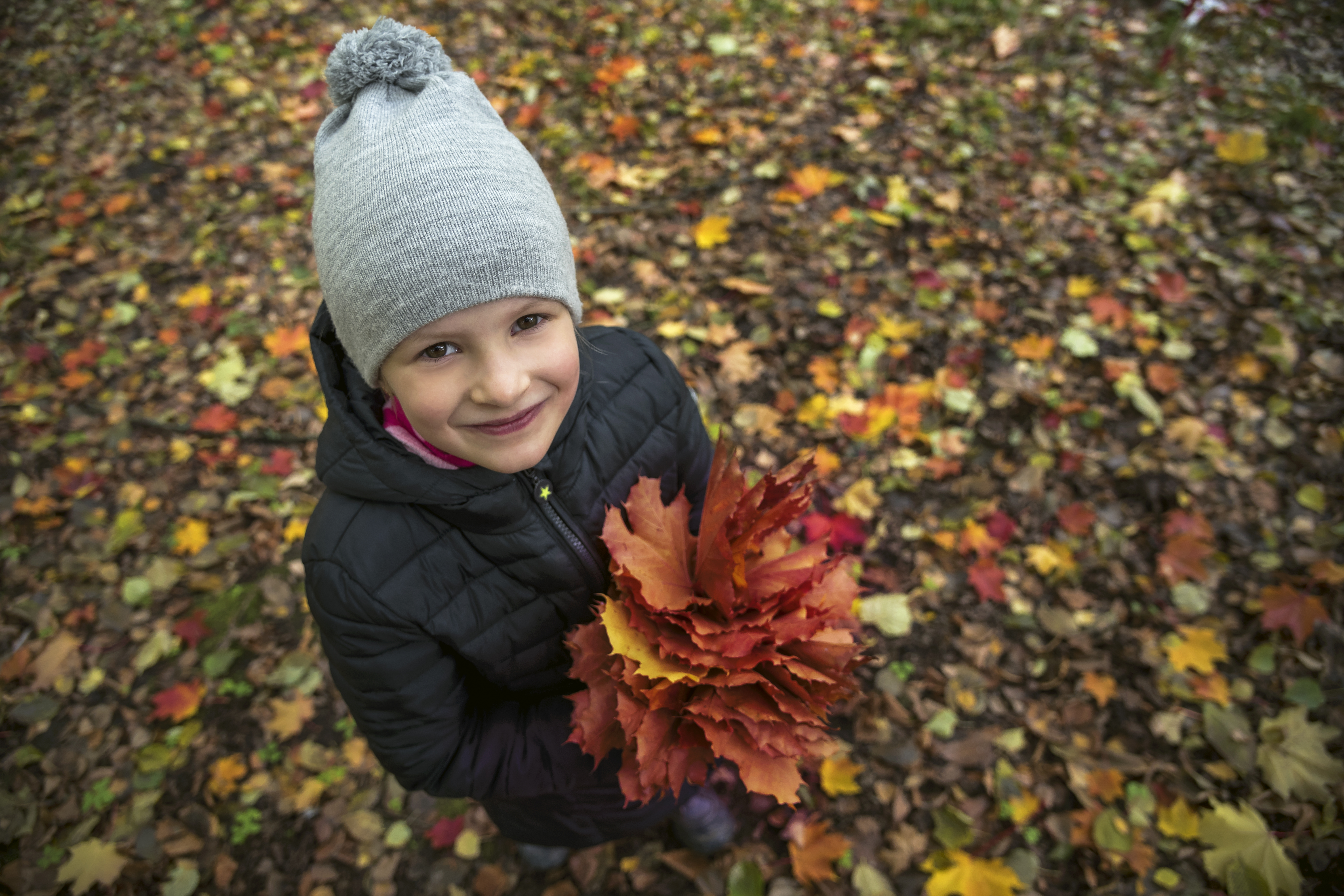Листья в руках девочки и в фоне создают снимку особенную осеннюю атмосферу.
