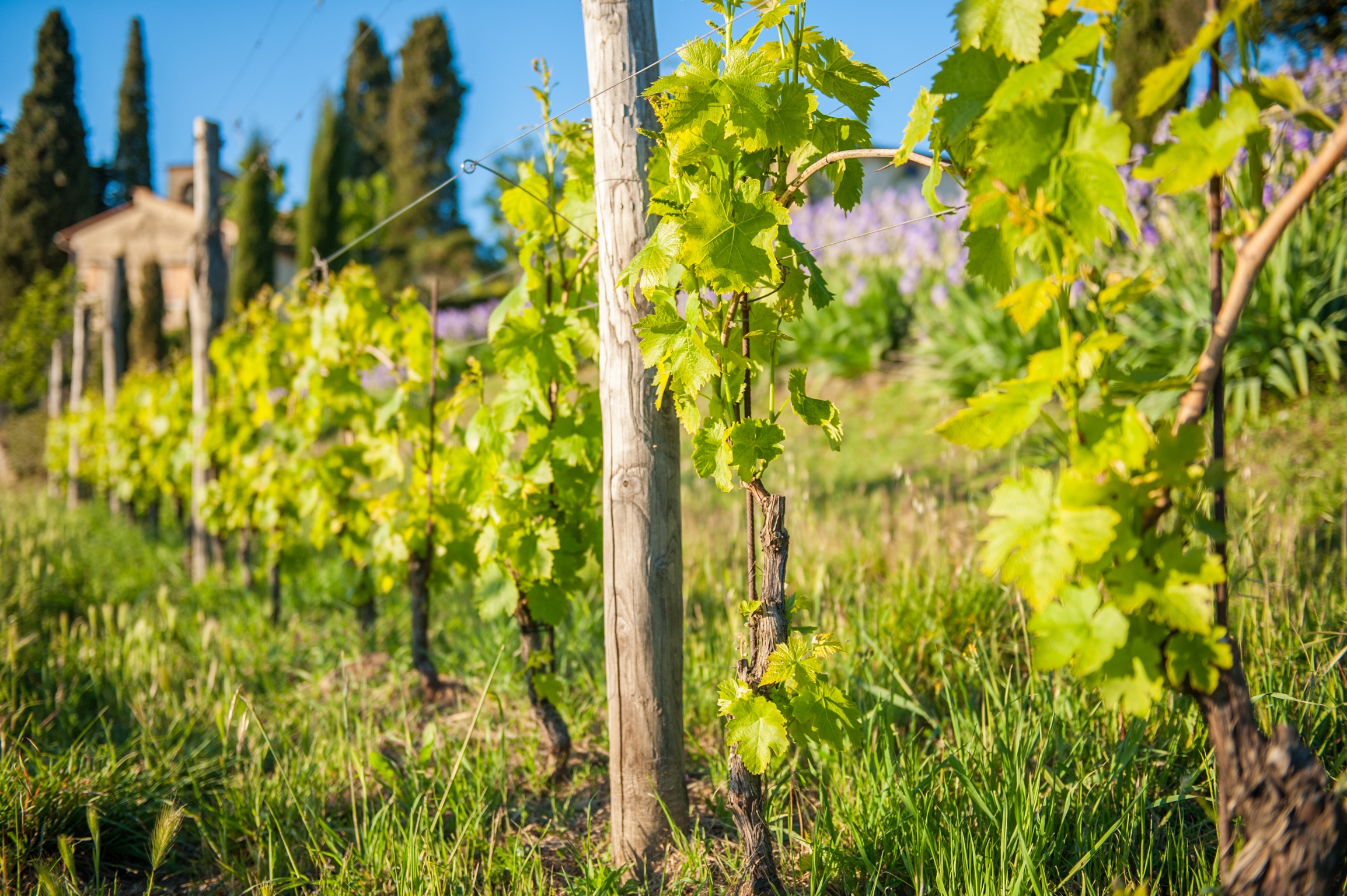 Лоза винограда отлично выделяется на фоне голубого неба.