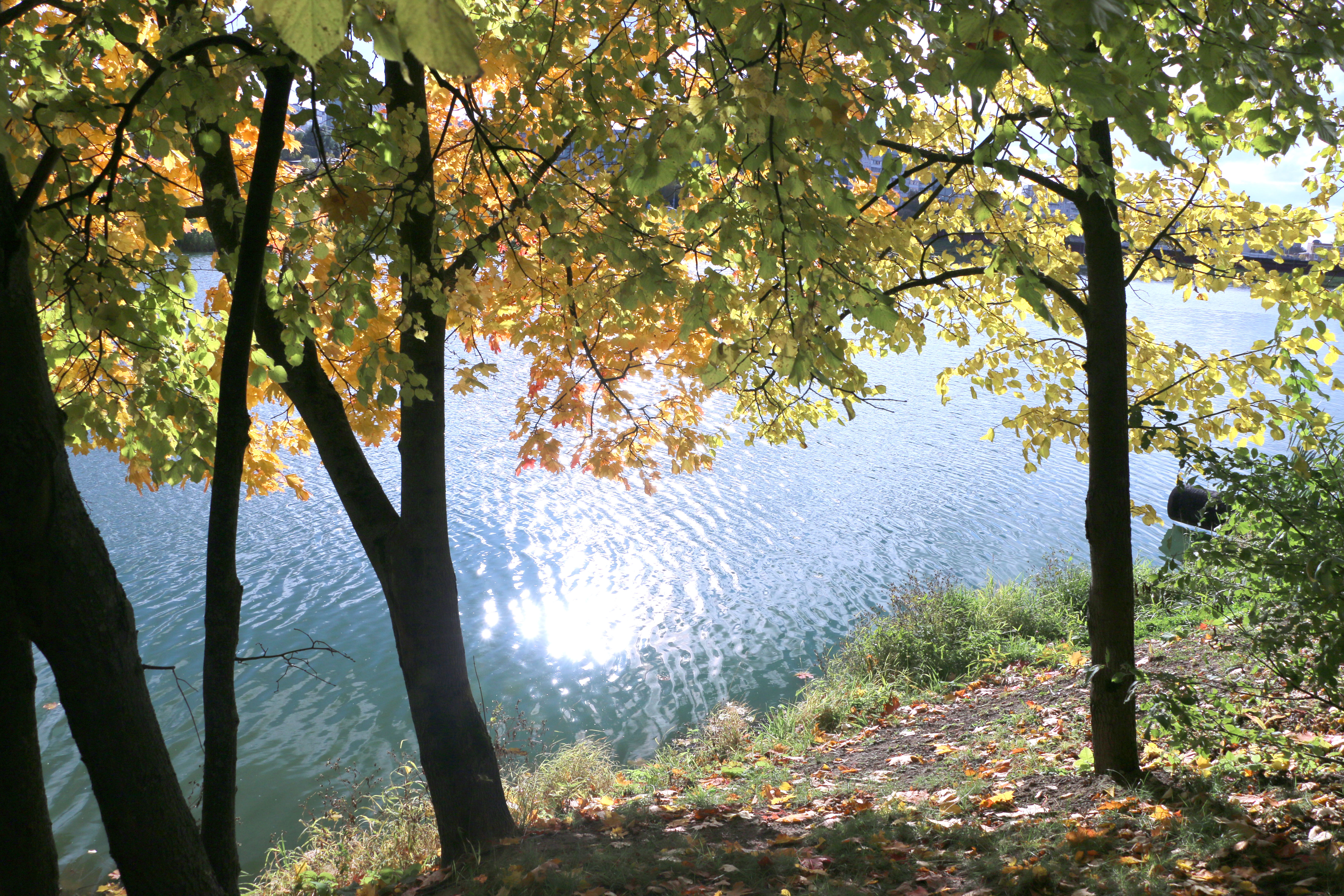 Добрый день! Снимала пейзаж днем, светило солнце. Камеру выставила с приоритетом диафрагмы ( F8, ISO 160). Понравились блики на воде, стояла в тени, кадр получился темноват.