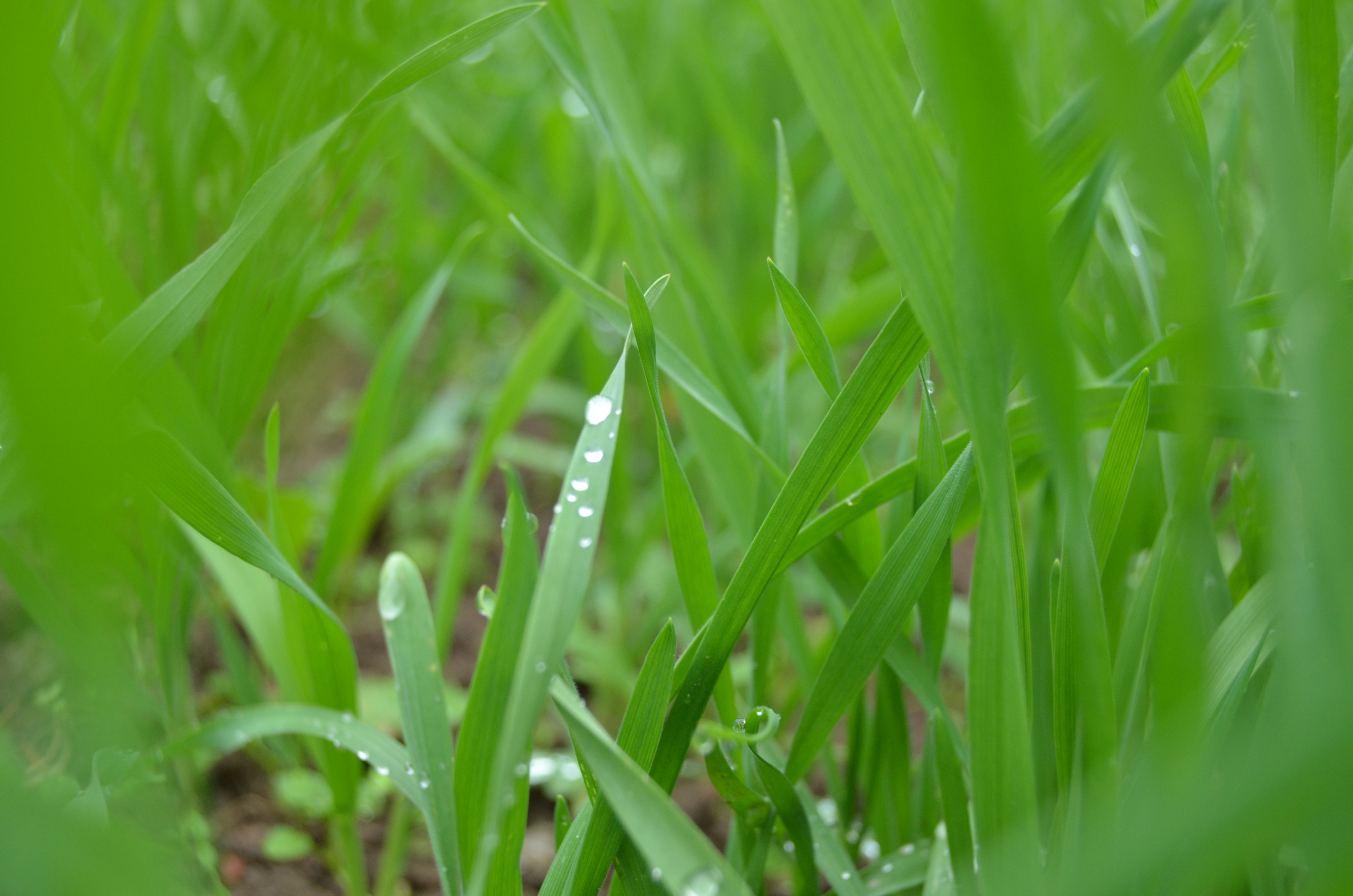 Камера сфокусирована на травинку в глубине кадра. Диафрагма приоткрыта и глубина резкости получилась маленькая, размытый фон усиливает внимание на этой травинке.