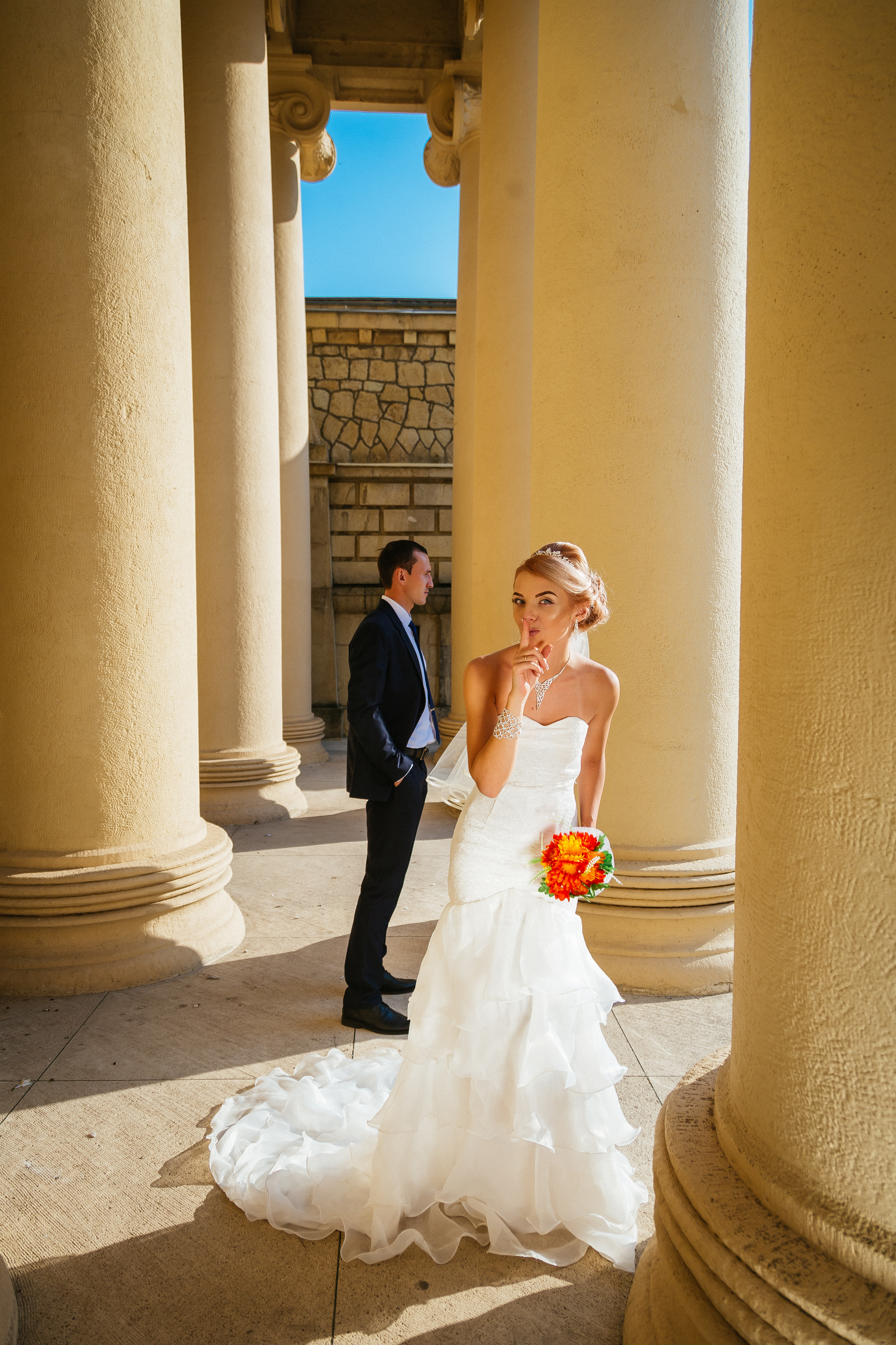 Она располагается в полосе света, бликами невеста отделена от фона.