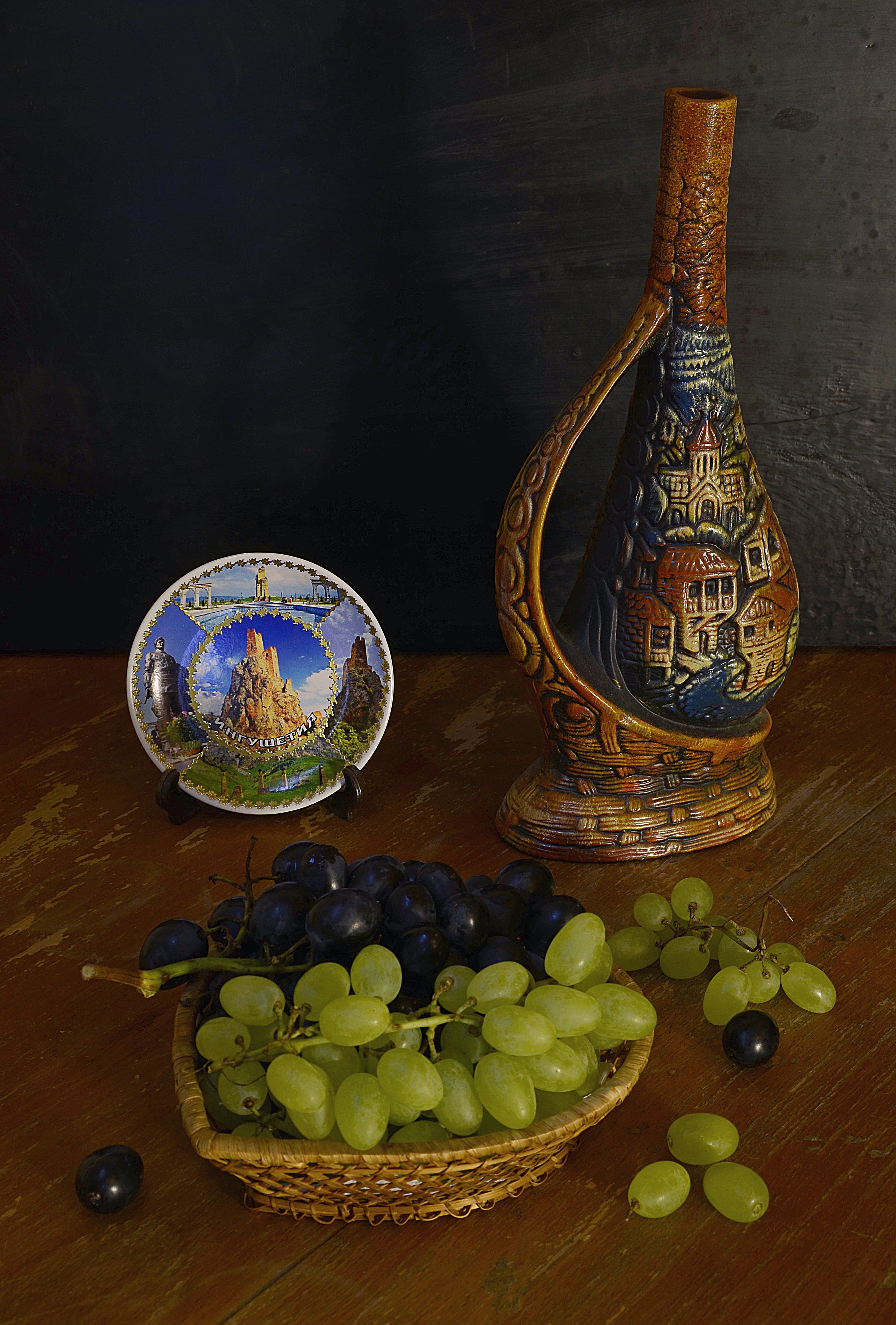 Решил поработать еще с этим сюжетом, докопаться, что делаю не так. Заменил фон, светлый забирает много внимания, часть винограда заменил на светлый-его лучше видно. Слева повесил светлую ткань для подсветки теней, прикрыл диафрагму. Освещение-то же бра + совсем немного подсветил фонариком темные места. Вроде сделал все правильно?