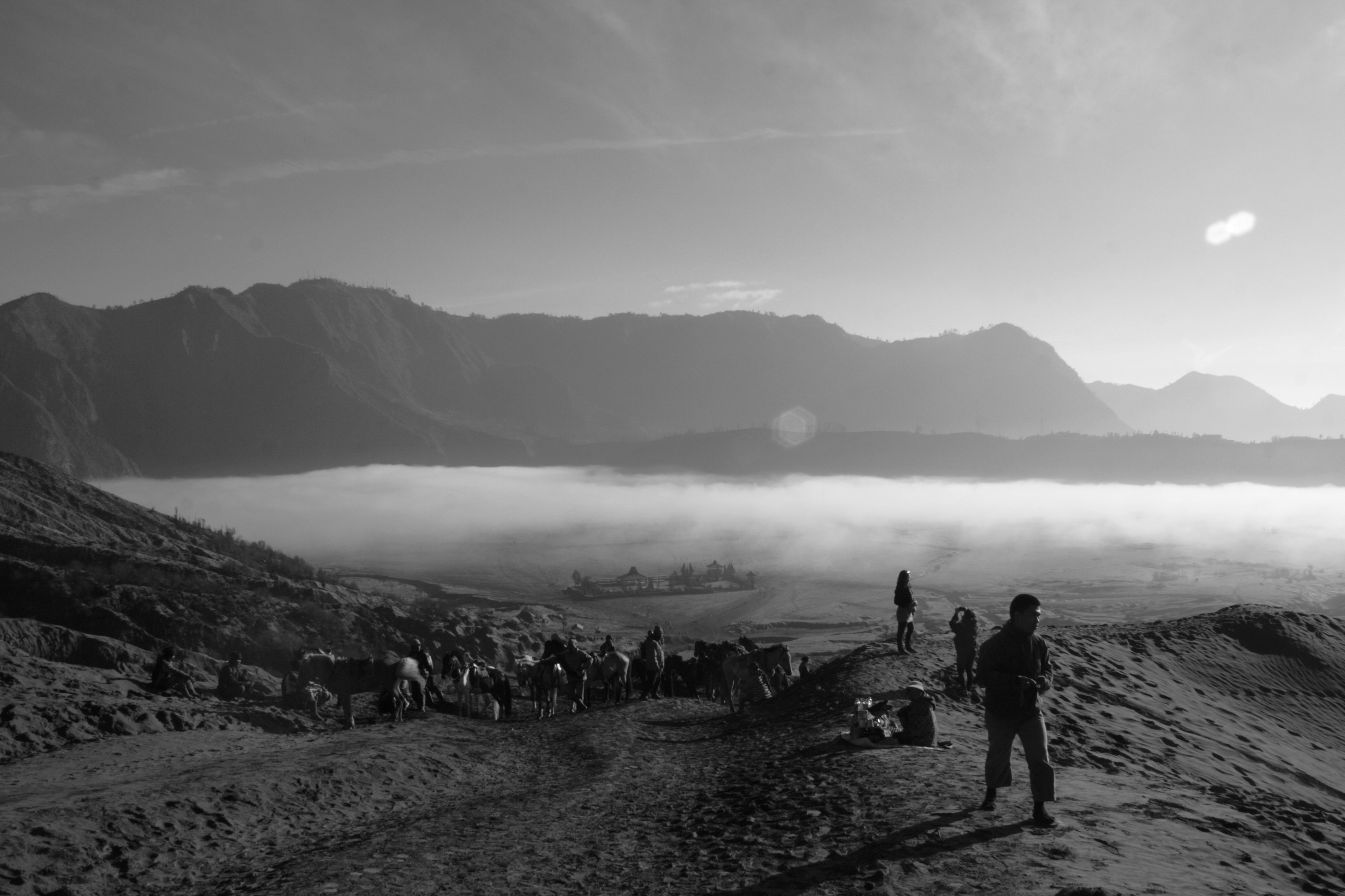 Из большого путешествия по ЮВА, Ява, долина вулкана Бромо. Выглядит очень загадочно сразу после восхода солнца, когда заполнена туманом, особенно буддийских храм посреди этой долины. p.s. цвет убран намеренно, имхо он здесь лишний
