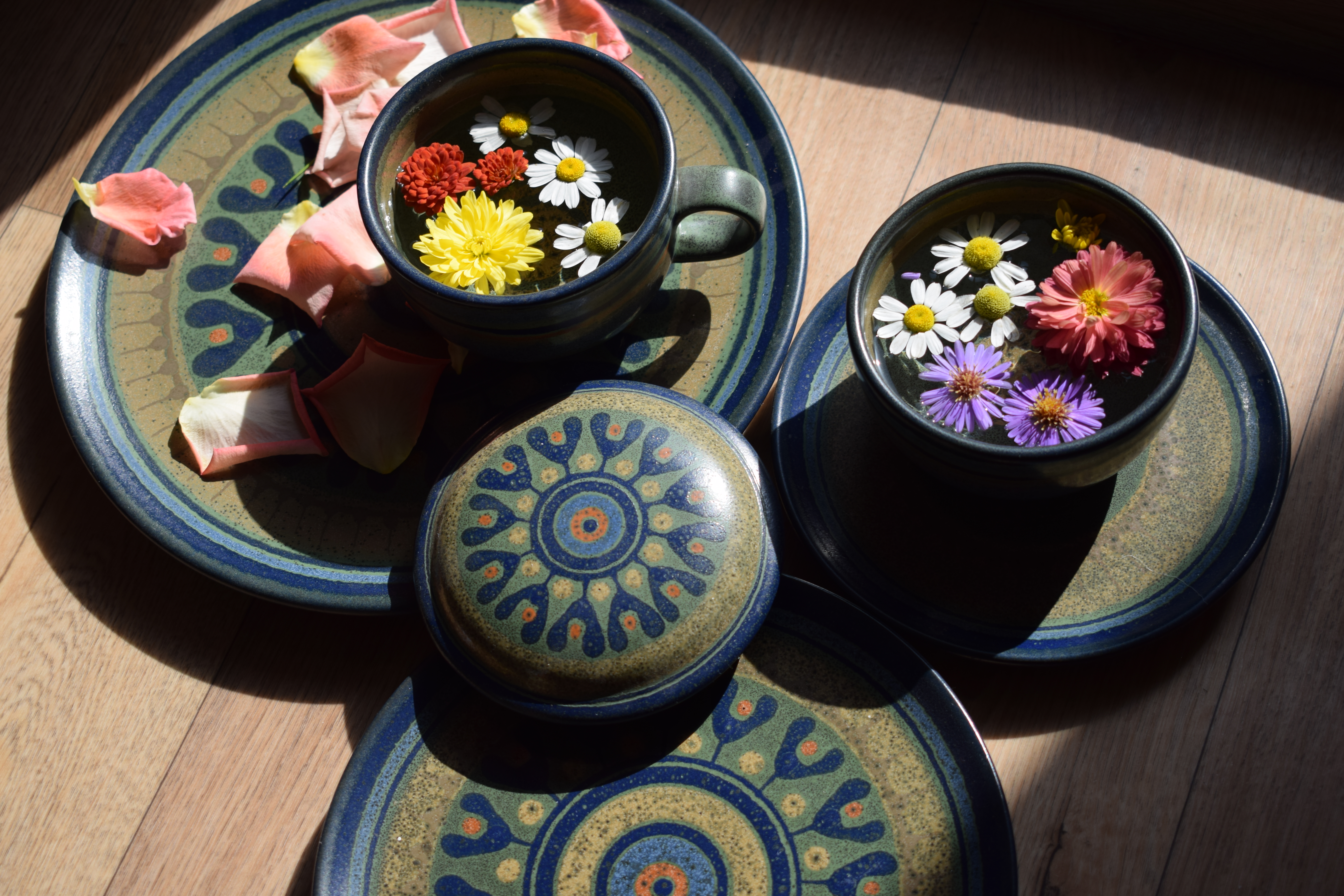 Тарелочка снизу оказалась пустовата , ее можно взять в кадр меньше , а сверху наоборот добавить фона перед кружками с цветами .