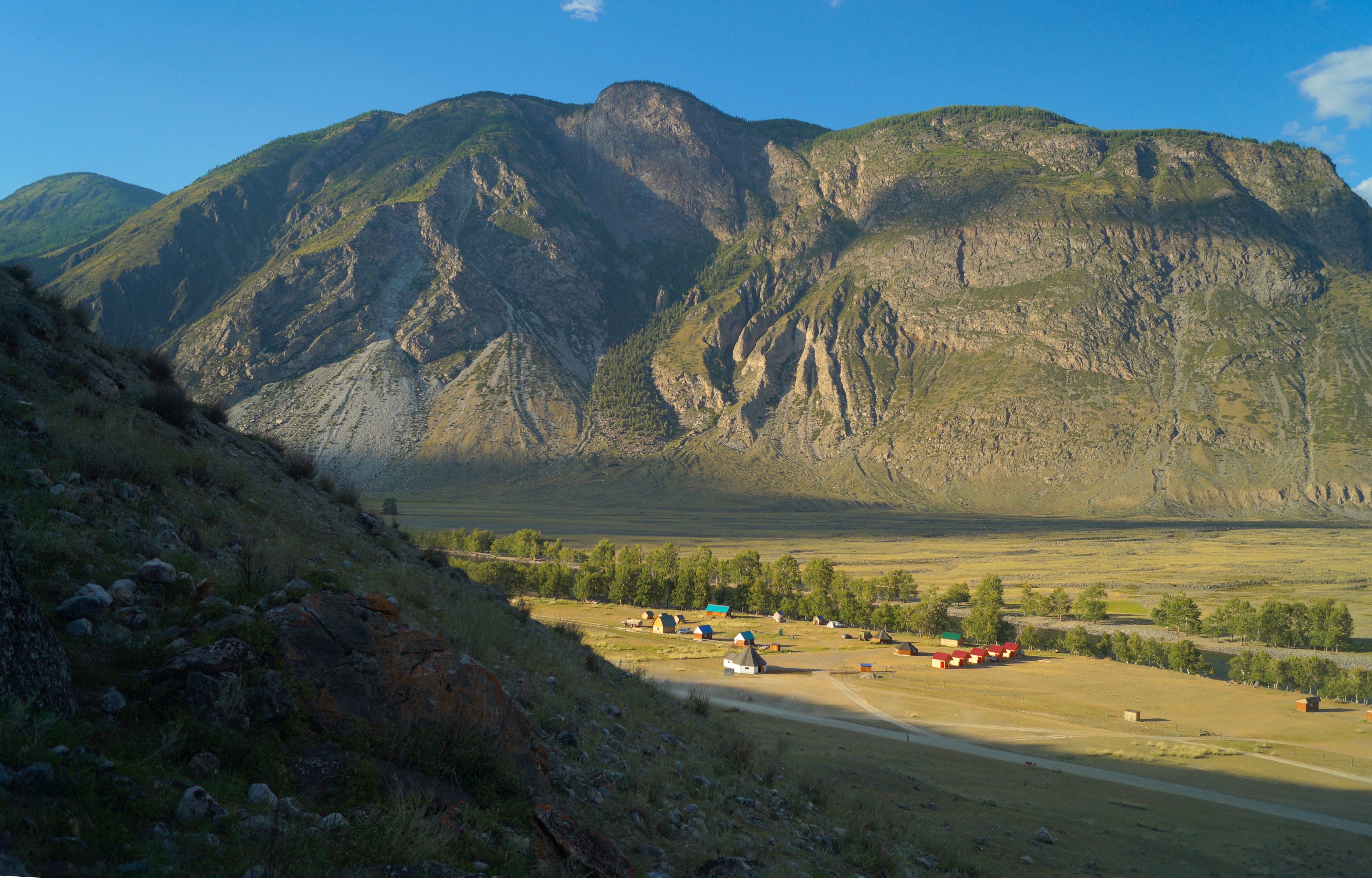 Удачно выбранная точка съёмки позволила достаточно выгодно преподнести сюжет. Боковой свет хорошо подсветил горы, что позволило замечательно преподнести сюжет. Дополнительные объекты помогают соотнести масштаб.