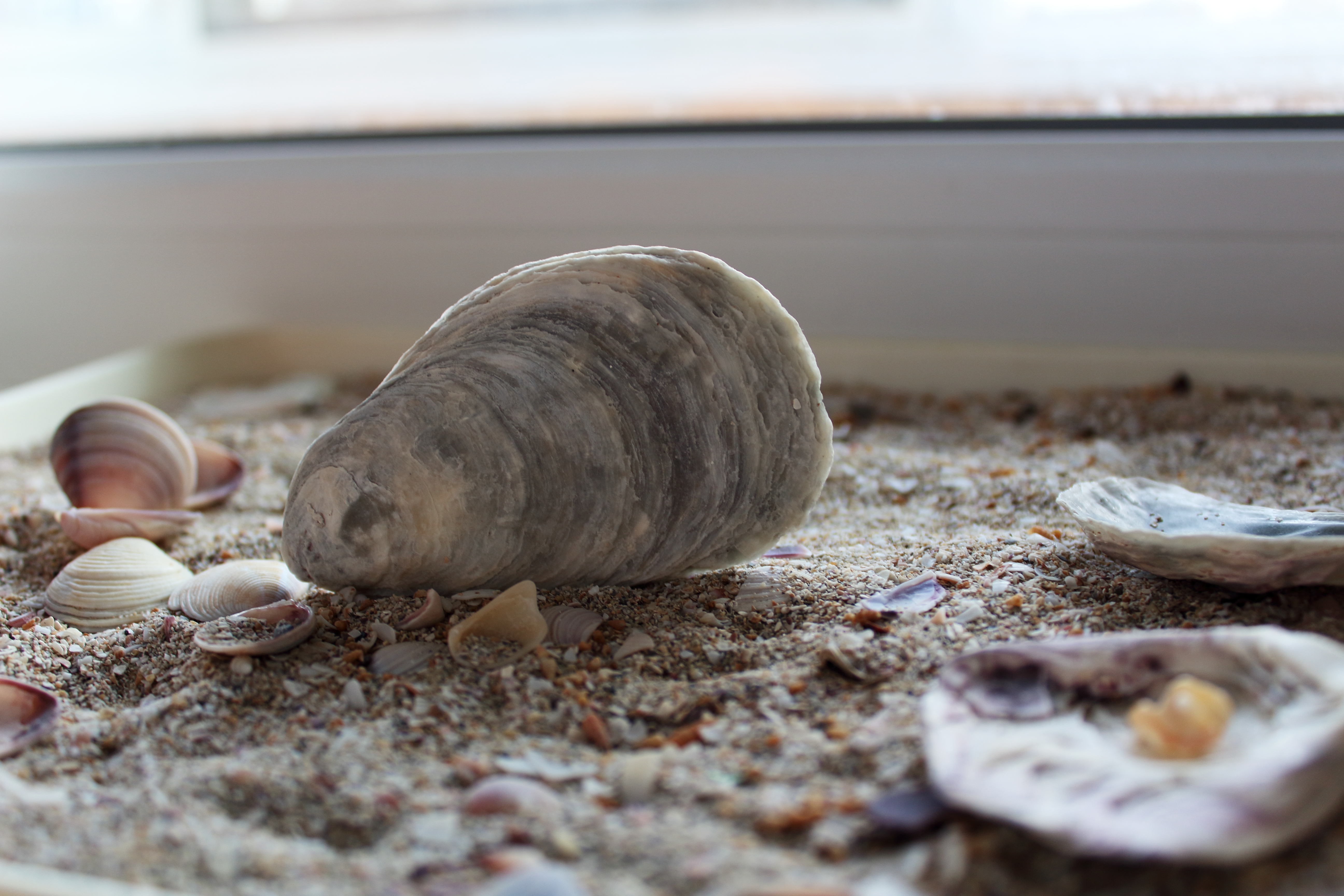 Диафрагма приоткрыта и глубина резкости получилась маленькая, размытый фон усиливает внимание на ракушке.