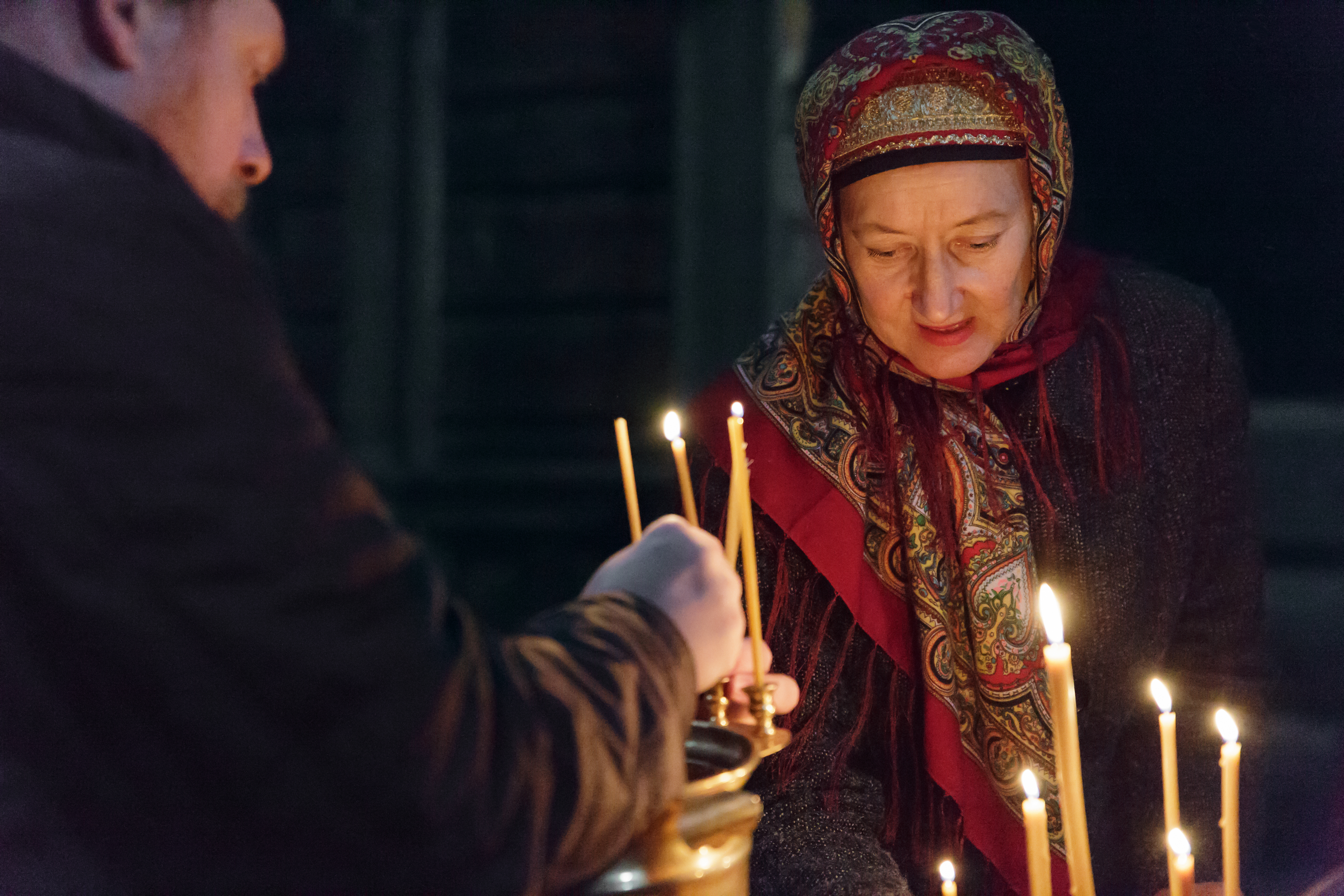 Подчеркнут взгляд женщины на свечки. ее лицо хорошо освещено.