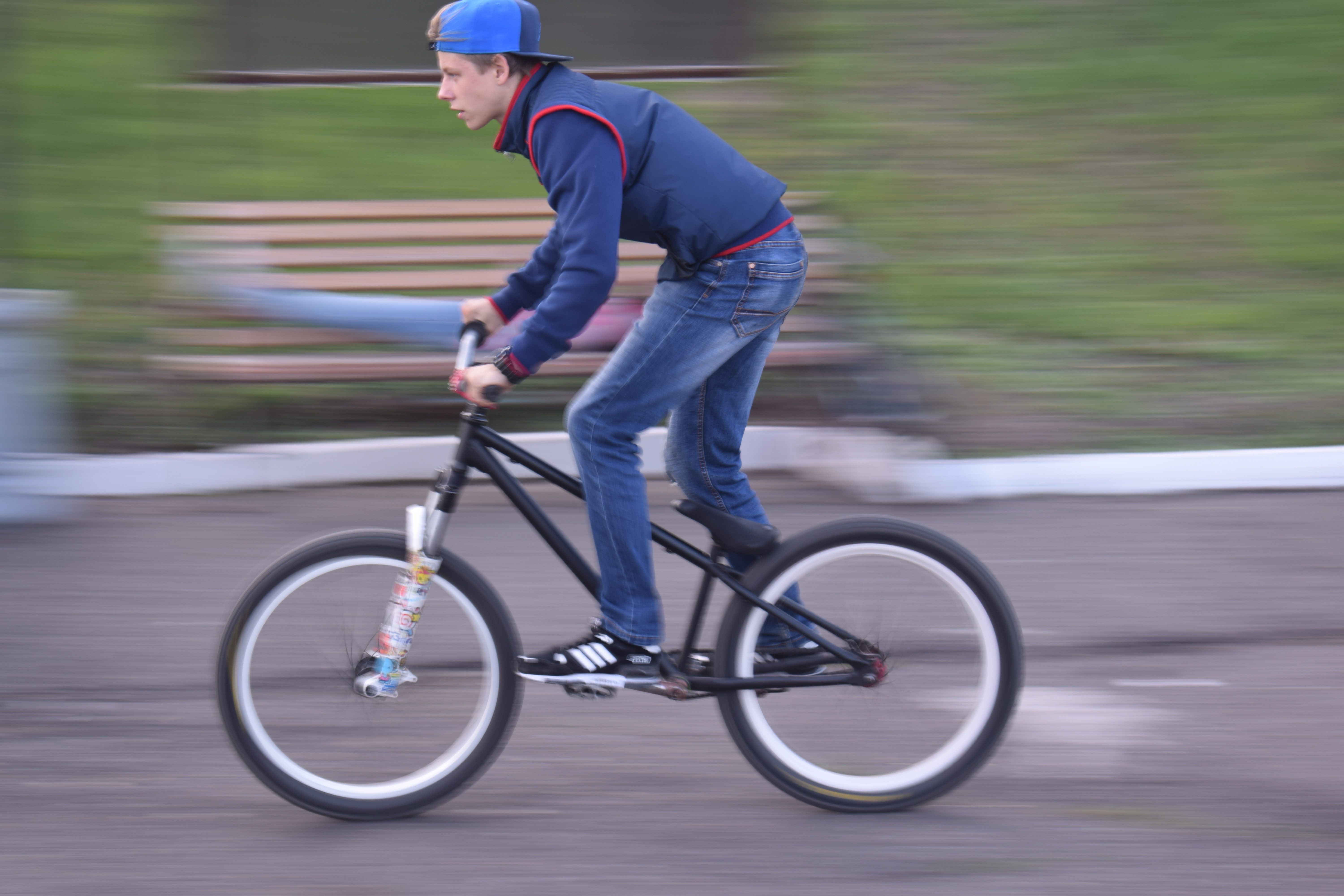 А вот проводка выполнена не очень корректно - есть небольшой смаз самого мальчика, он получился недостаточно резким. Перед ним оставили места меньше, чем за спиной, из-за этого снимок не выглядит таким динамичным, т.к. есть ощущение, что велосипед скоро упрется в край кадра.