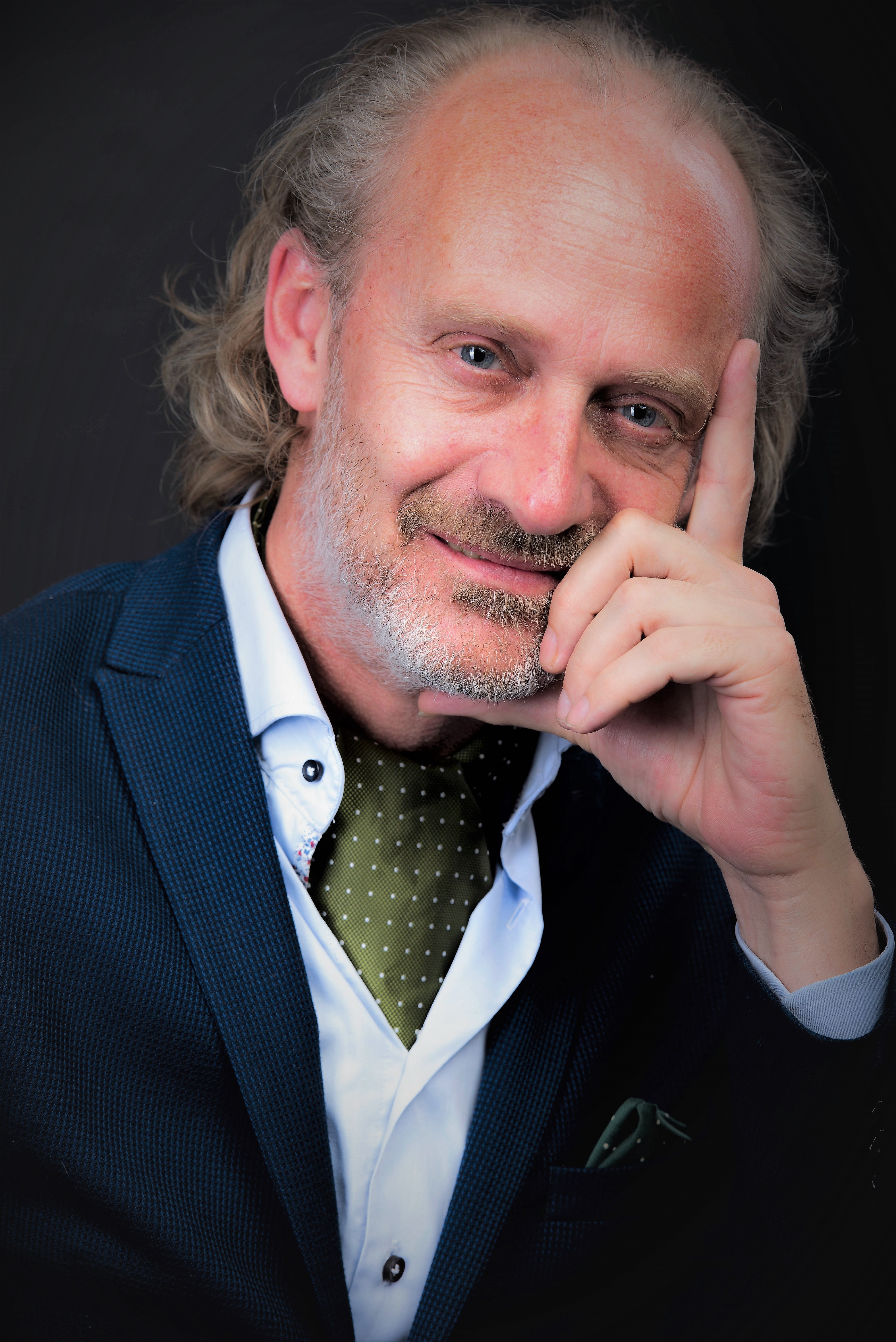 Моя модель - известный роттердамский галлерист Маарт Валда. Общая знакомая уговорила прийти его к нам вечером в студию на пару снимков после работы над новой выствкой. Маарт устало, но водушевленно рассказывал о своей работе,а я его фотографировал,используя рисующий свет- октабокс 120 см ; заполняющий - два стрипбокса 30 х 120 см; фоновый - рефлектор с сотами и в качестве контрового освещения - большой серебристый отражатель - 119 см. От портретной ретуши отказался по просьбе модели.
