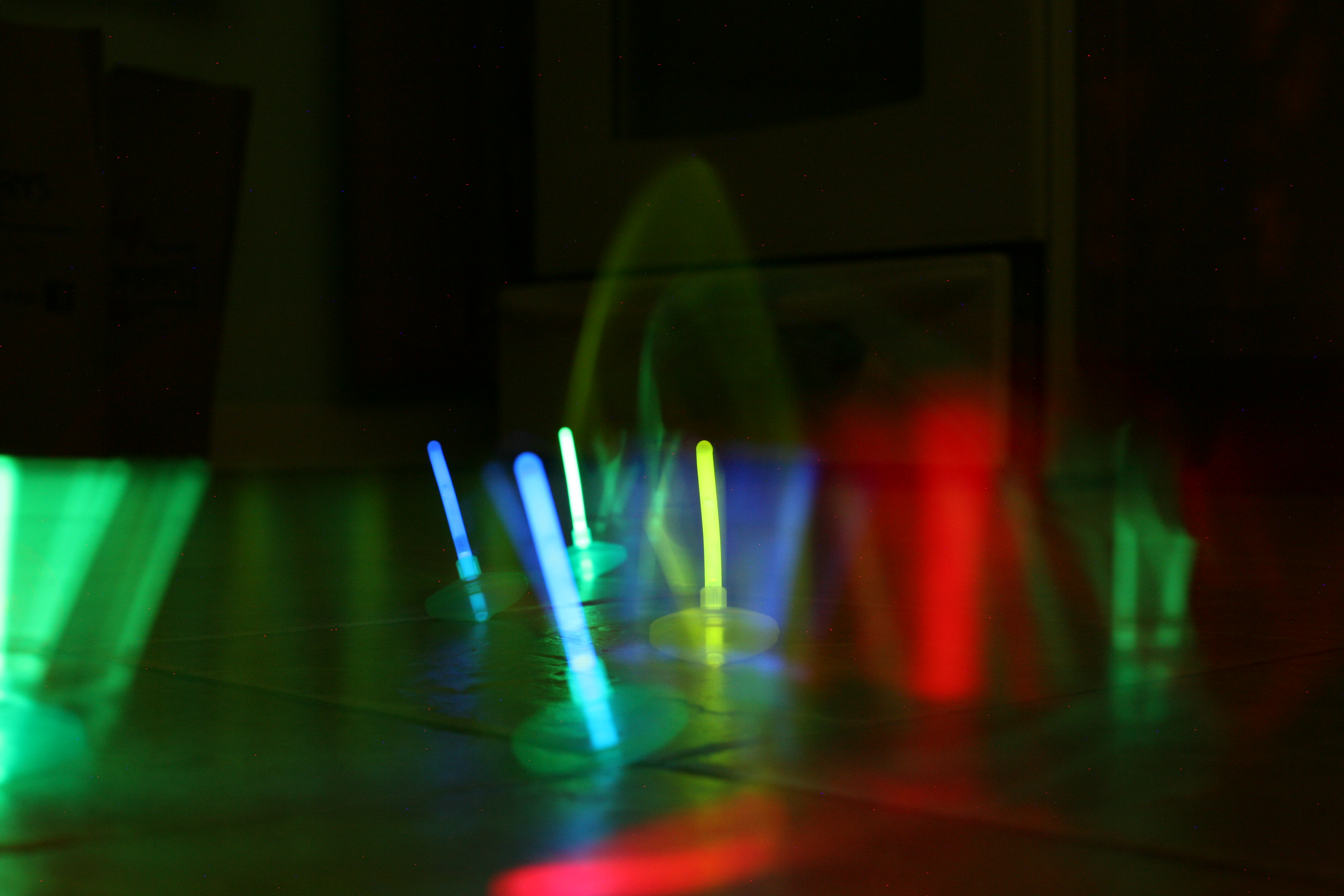 A glow stick spinner in the dark. The shot captured the movement of the spinners and crated a disco night feeling.