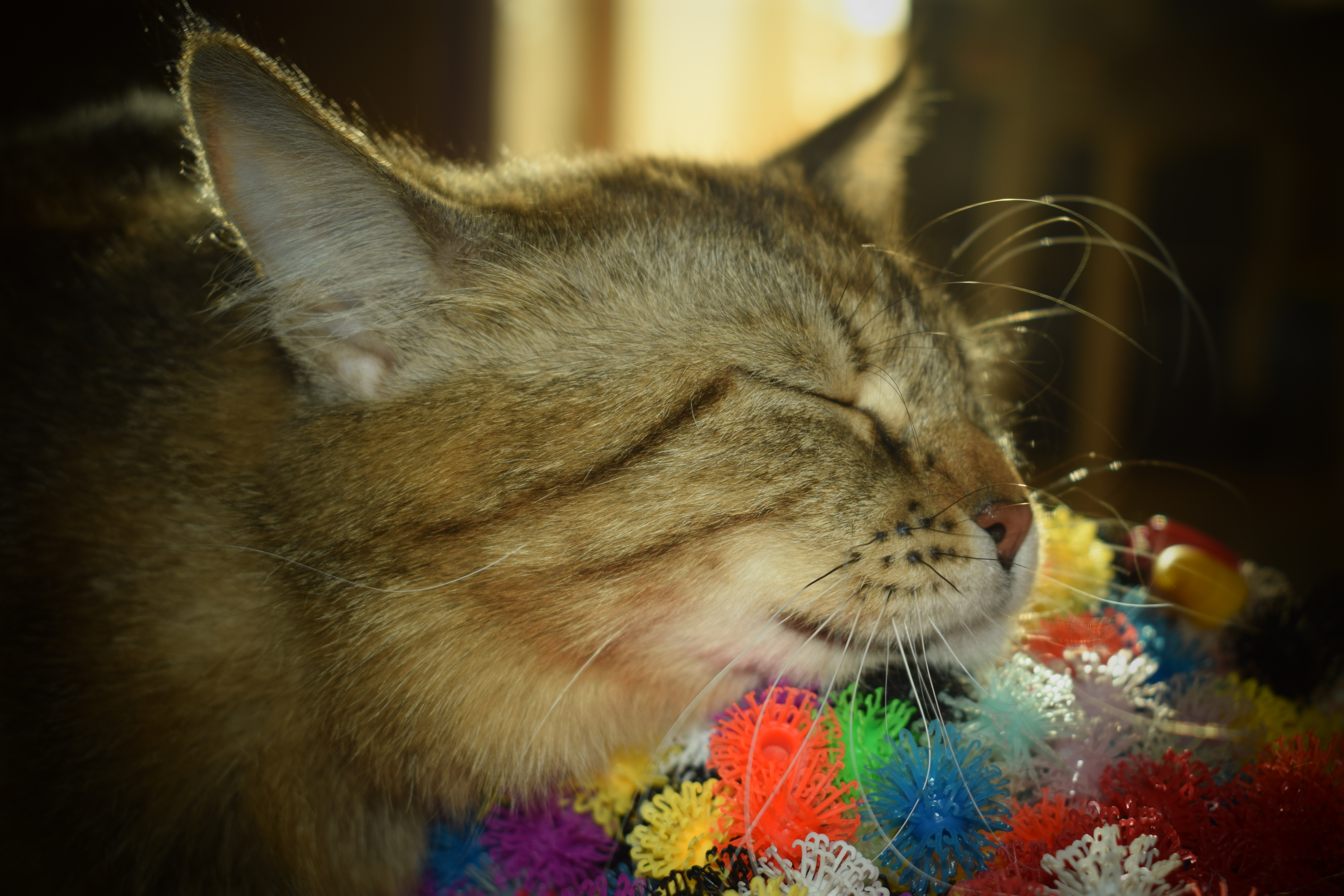 Яркие цветные детали в нижней части кадра немного отвлекают от котика.