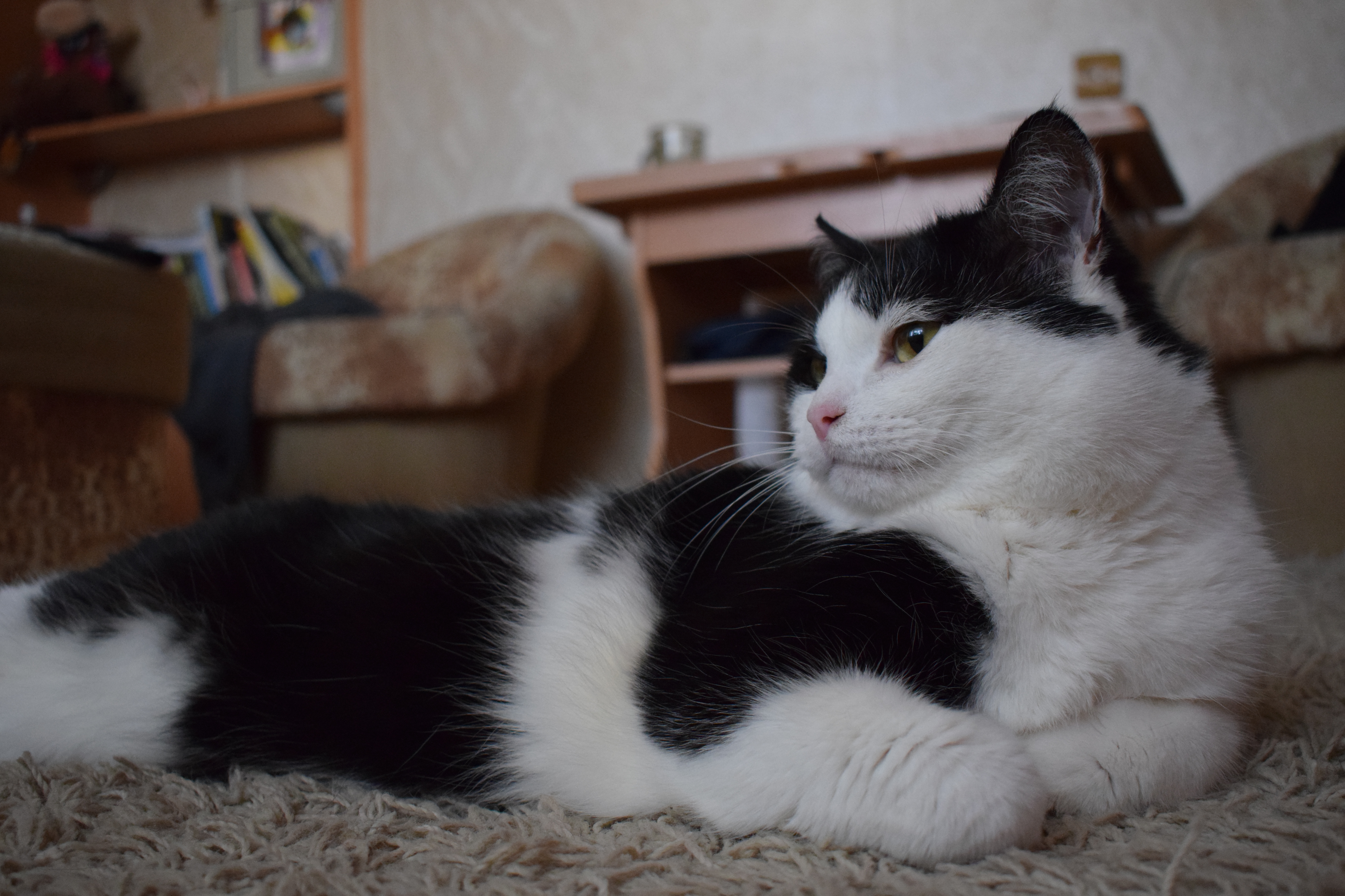 Хороший снимок! Выбран отличный ракурс для съемки - низкая точка позволили показать в непривычно ракурс животное. Так же за счет этого в кадр попал задний план, он неплохо размыт и дополняет интерьером портрет. Автофокус сработал корректно - морда животного достаточно резкая.