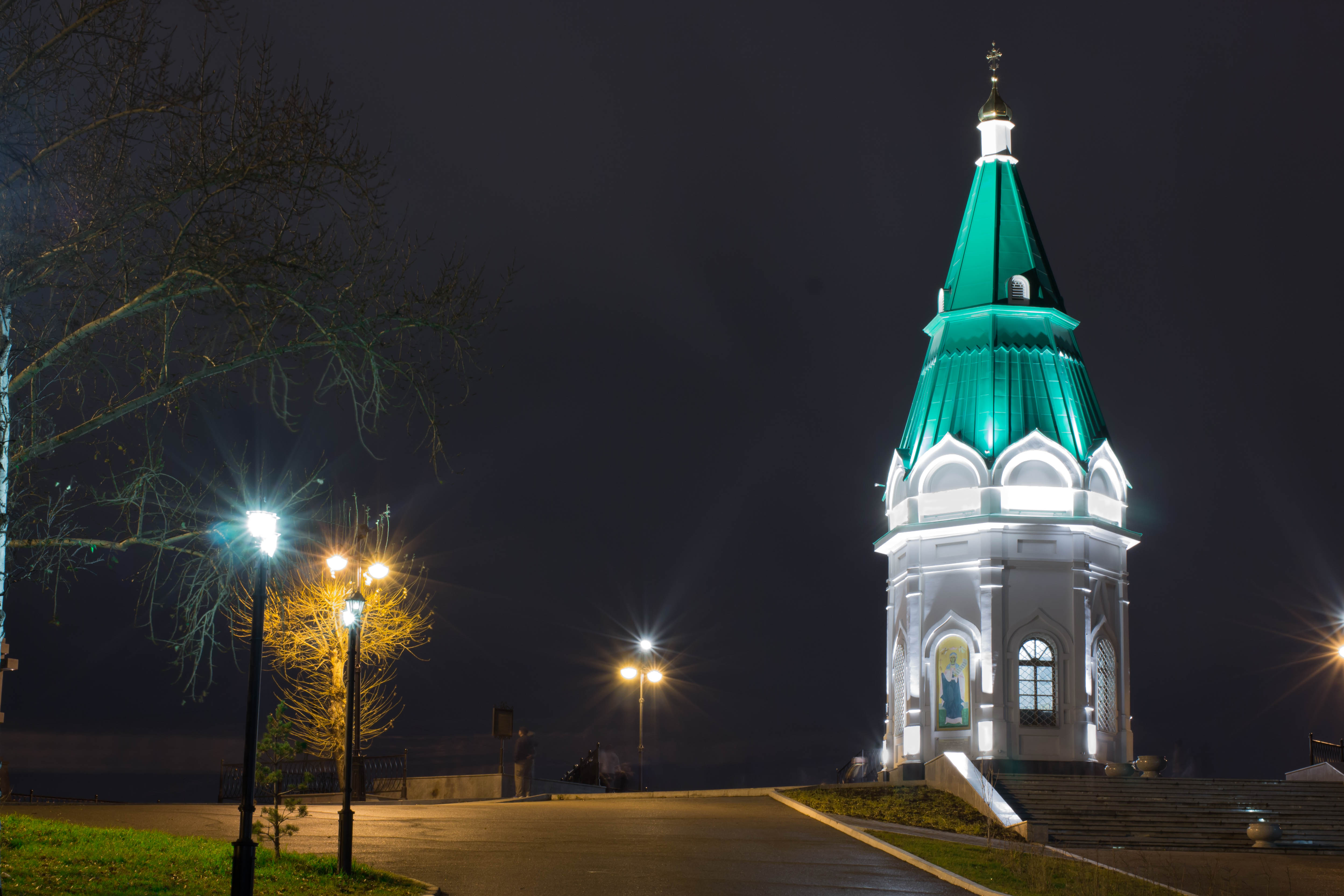 Здравствуйте! Есть ряд вопросов по этому фото: 1. Пересветы, нужно еще поработать кистью 2. Расположение часовни, слева кается более гармоничнее, но не смог получить четкий кадр, поэтому фото слева 3. Балан белого. На разных мониторах поразному. Возможно холодноват 4. Хочется обрезать справа кусок фонаря и слева ствол 5. При выравнивании вертикали завалил фонари, видимо, нужно искать баланс между фонарями и часовней.