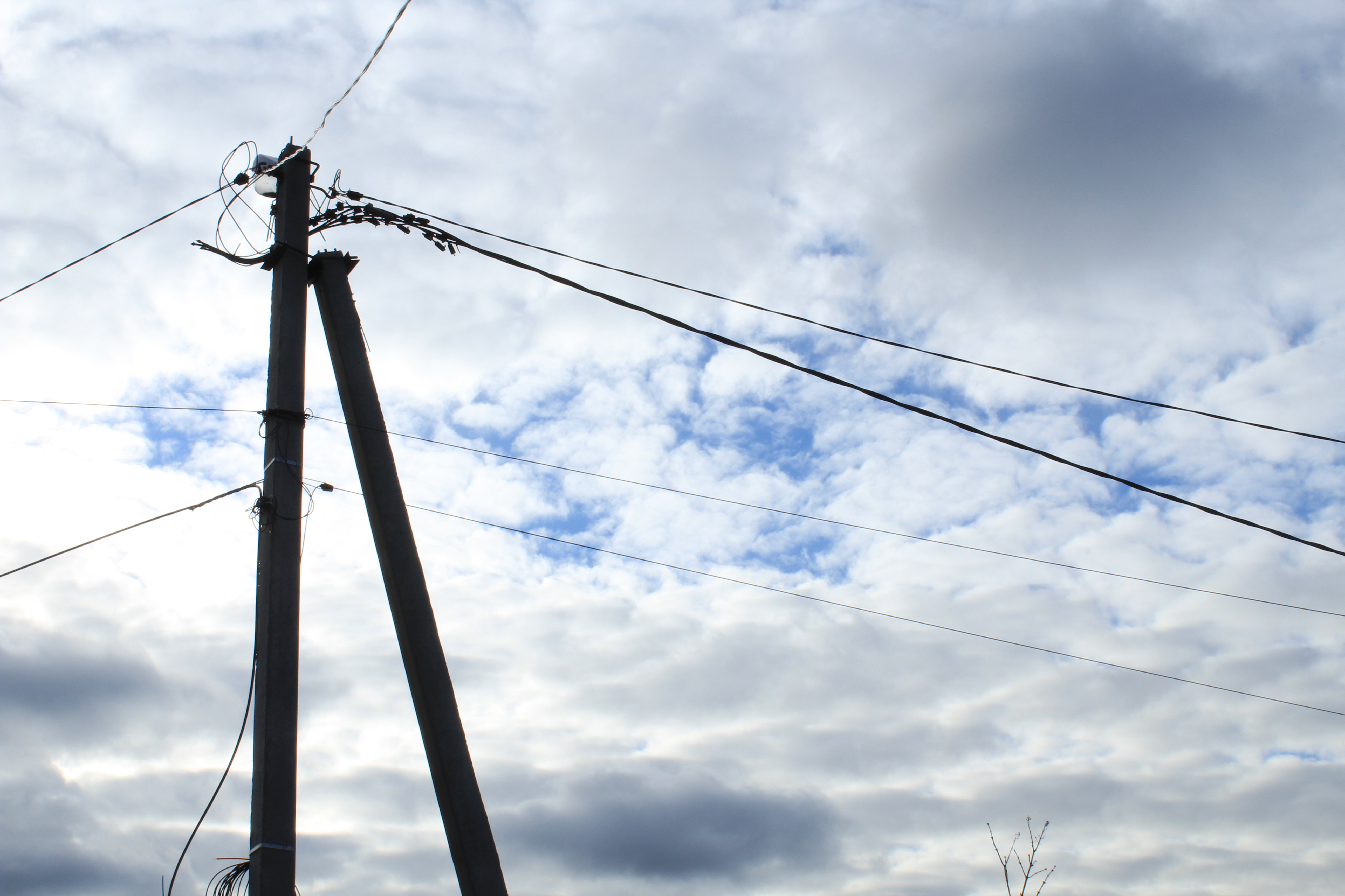 Силуэт столба и проводов отлично выделяется на фоне яркого неба.