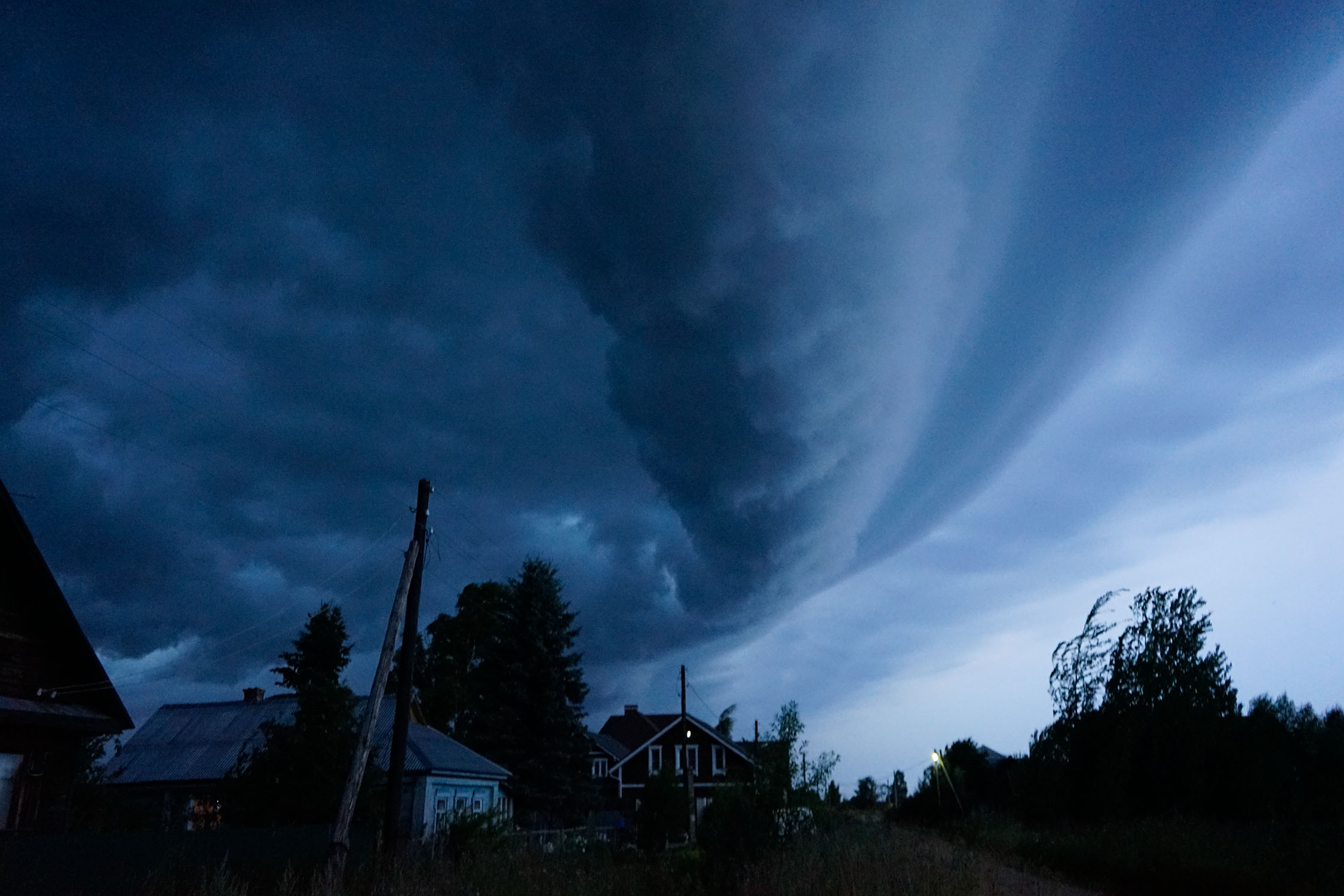 Интересное явление вам удалос заснять,так называемый Грозовой воротник. И небо в данном случае является именно главным героем, поэтому вы вполне оправдано уделили ему больше внимания. Подход к съёмке так же верный, исо было увеличено до 6400 единиц, что позволило сократить выдержку до 1/50 и избежать смаза. Объекты инфраструктуры помогают зрителю лучше соотнести масштаб.
