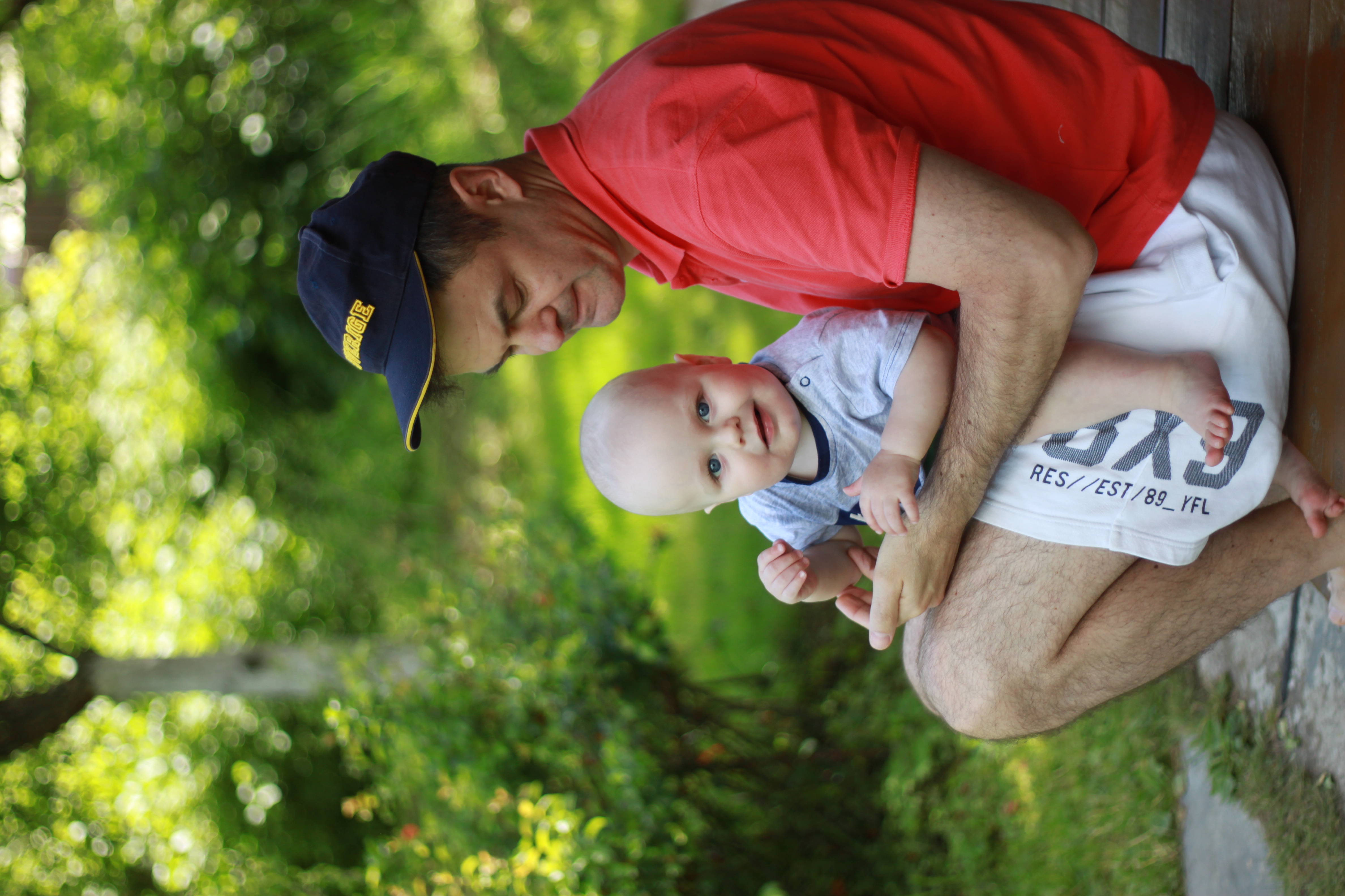 Достаточно хороший кадр! Неплохо поймали взгляд и эмоции на лице малыша. Красиво размыт задний план, создано красивое боек из зелени. Одежда хорошо контрастирует с зеленью на заднем плане. В данном случае мужчина неплохо смотрит на ребенка и смотреть в кадр не обязательно. Снимок за счет этого наоборот получился более спокойным и непринужденным.