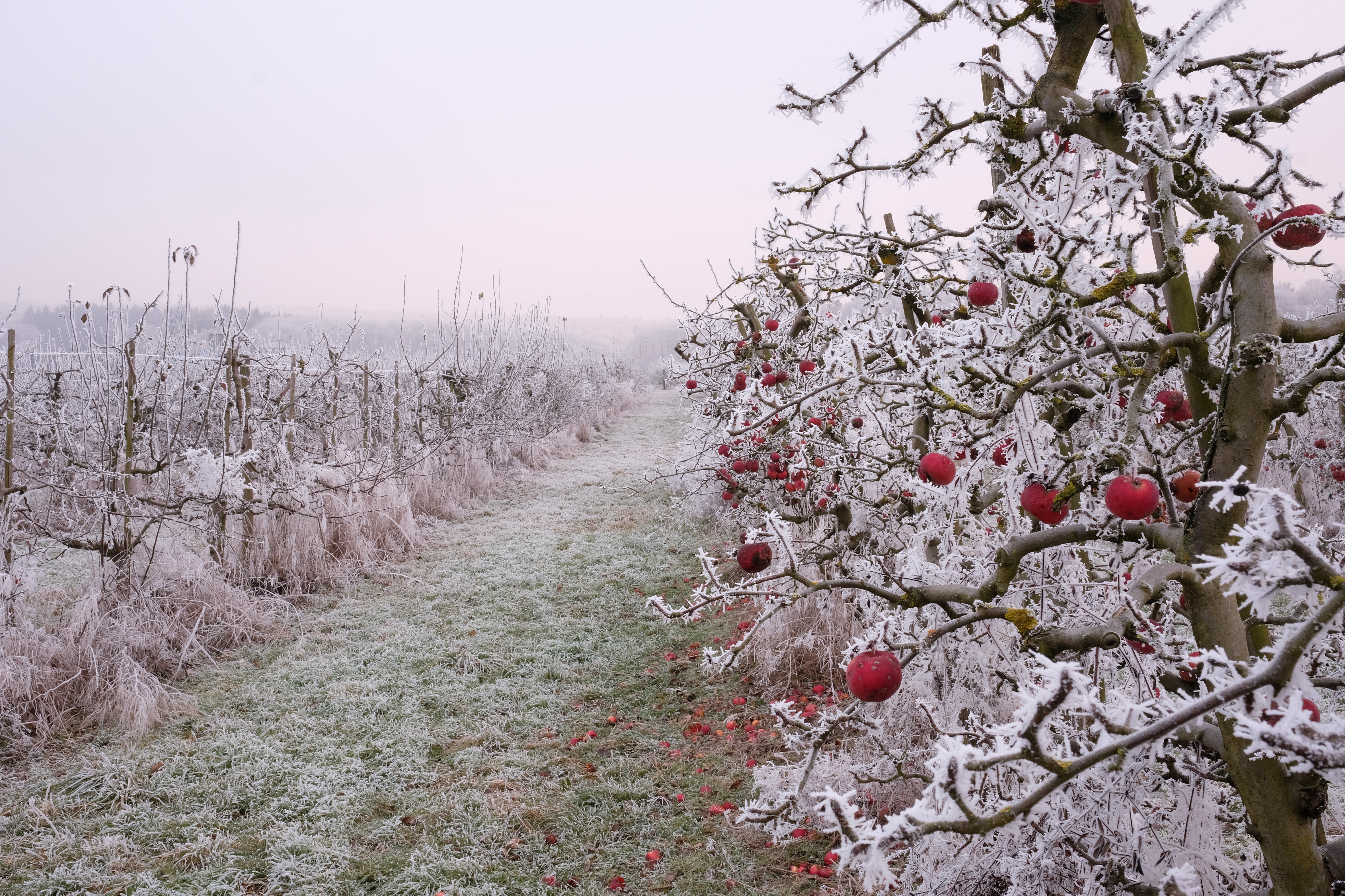 Очень хороший кадр! Получился очень атмосферный снимок! Удачно засняли иней, он украсил природу красивым белым цветом. Яркие яблоки создают акценты на снимке, добавляя яркие пятна цвета. Приятный и нежные цвета у снимка. Дымка на горизонте разбивает план, усиливая глубину снимка. Хорошо справились с достаточно длинной выдержкой.
