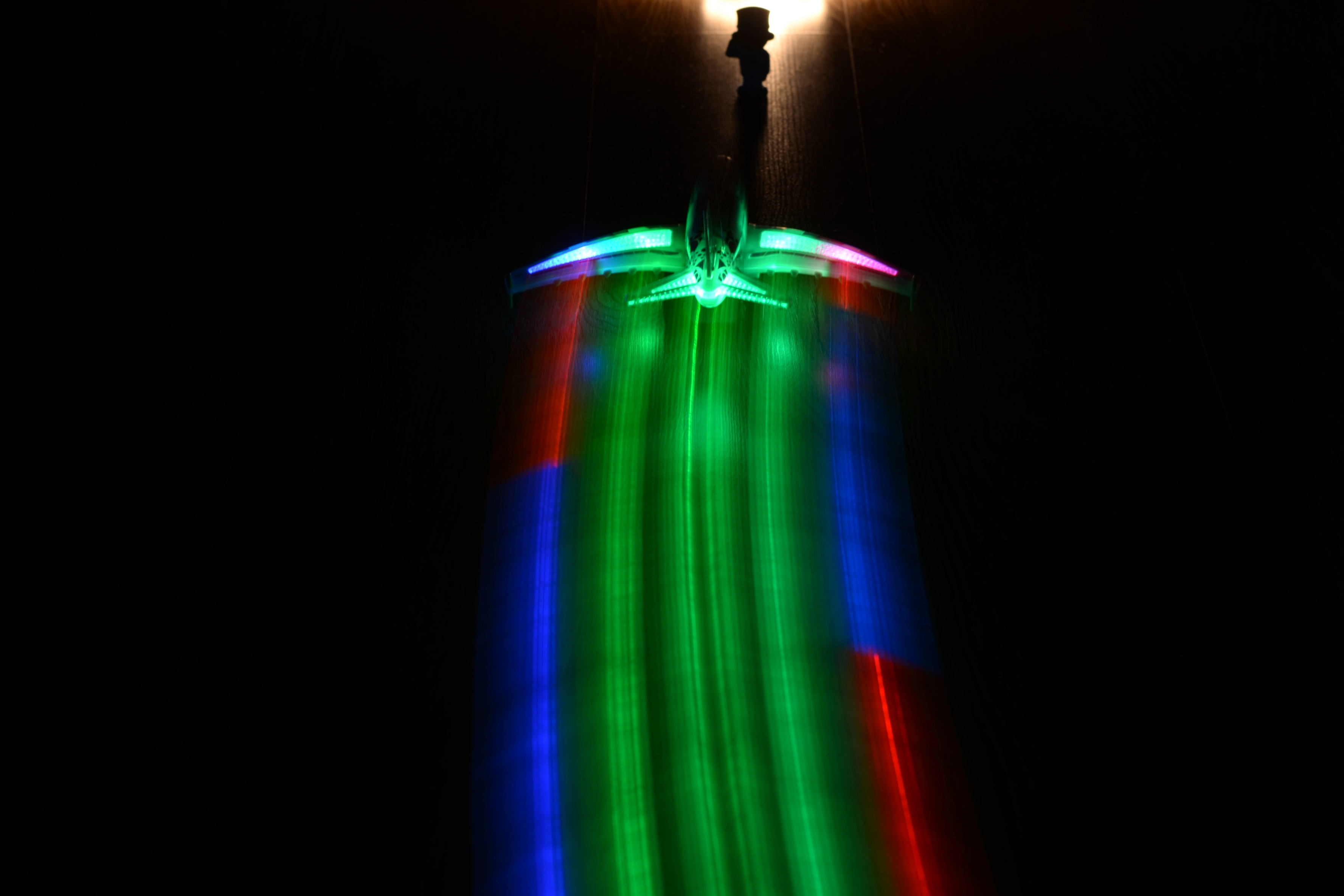 Хороший снимок! Выбрали весьма эффектный объект для съемки - самолетик создал за собой ярки разноцветный шлейф . Благодаря корректным параметрам удалось получить красивый трек от его движения, при этом в конце удалось зафиксировать игрушку на снимке. небольшой изгиб помогает придать динамику снимку.