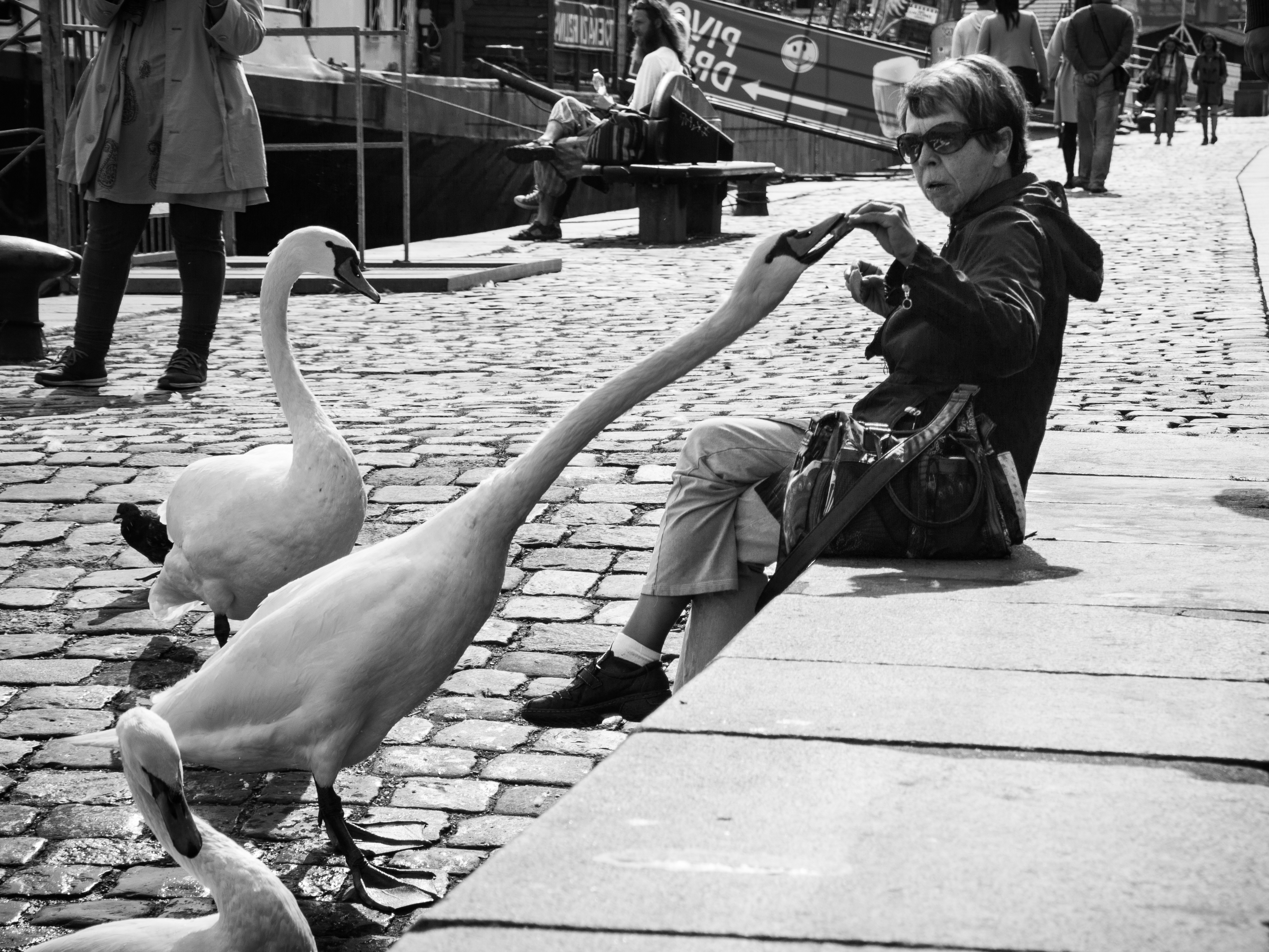 Женщина на берегу Влтавы в Праге кормила хлебом местных лебедей, и была крайне поражена наглостью одного из пернатых. Перевела в чб, чтобы цвет не отвлекал от сюжета, и отразила кадр горизонтально, чтобы получить восходящую диагональ.
