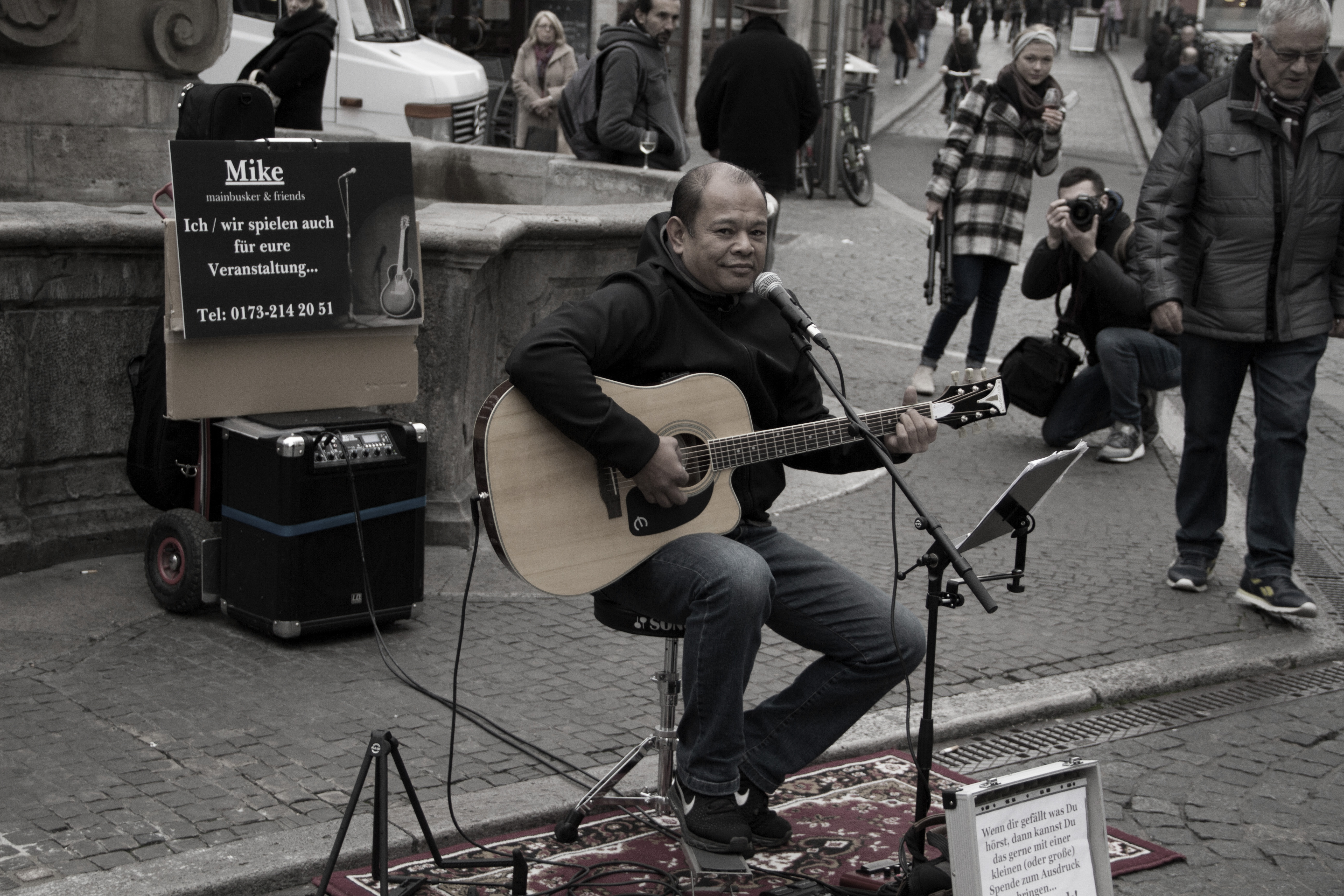 Уличный музыкант, мне кажется, неплохо получилось поймать взгляд, кадр перевела в более черно-белые тона, думаю, что так смотрится лучше