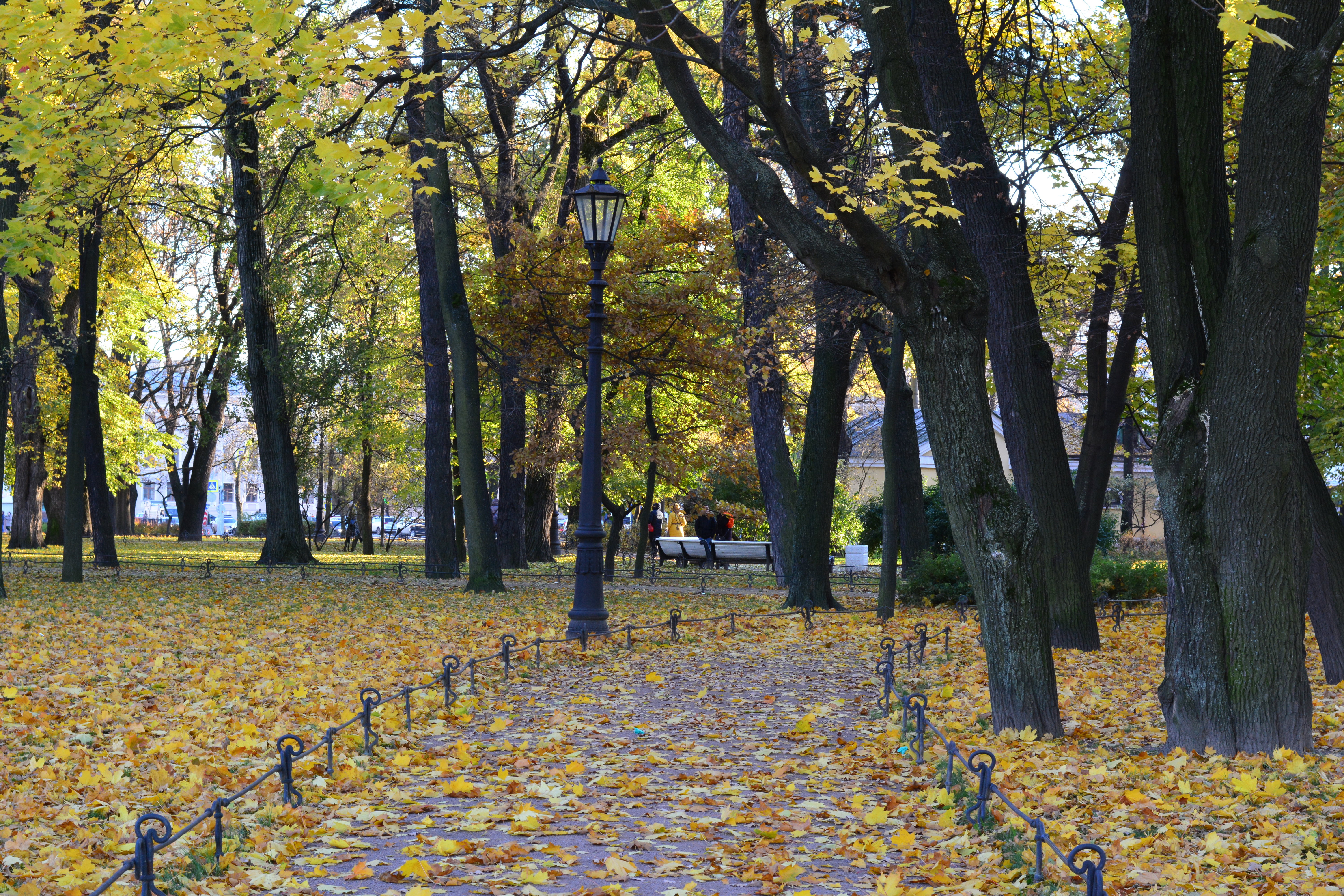 Судя по фонарю есть ощущение небольшого наклона снимка вправо. Так же неплохо было бы половить свет в самом парке, чтобы он интересно подсветил деревья и яркую листву.