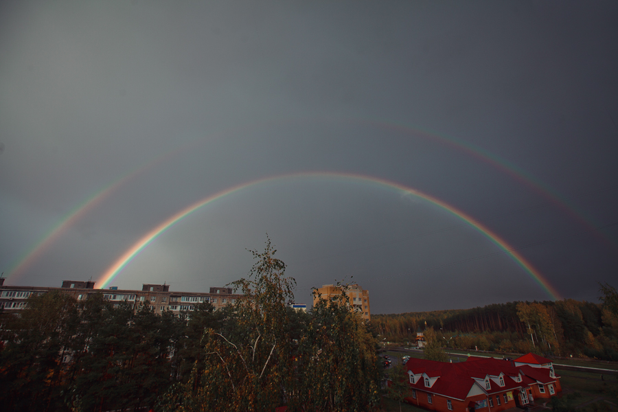 Хороший снимок! Неплохо пойман момент с двойной радугой. Она отлично выделяется на фоне достаточно темного неба. Широкий угол позволил поместить в кадр радугу полностью, не обрезая ее края.