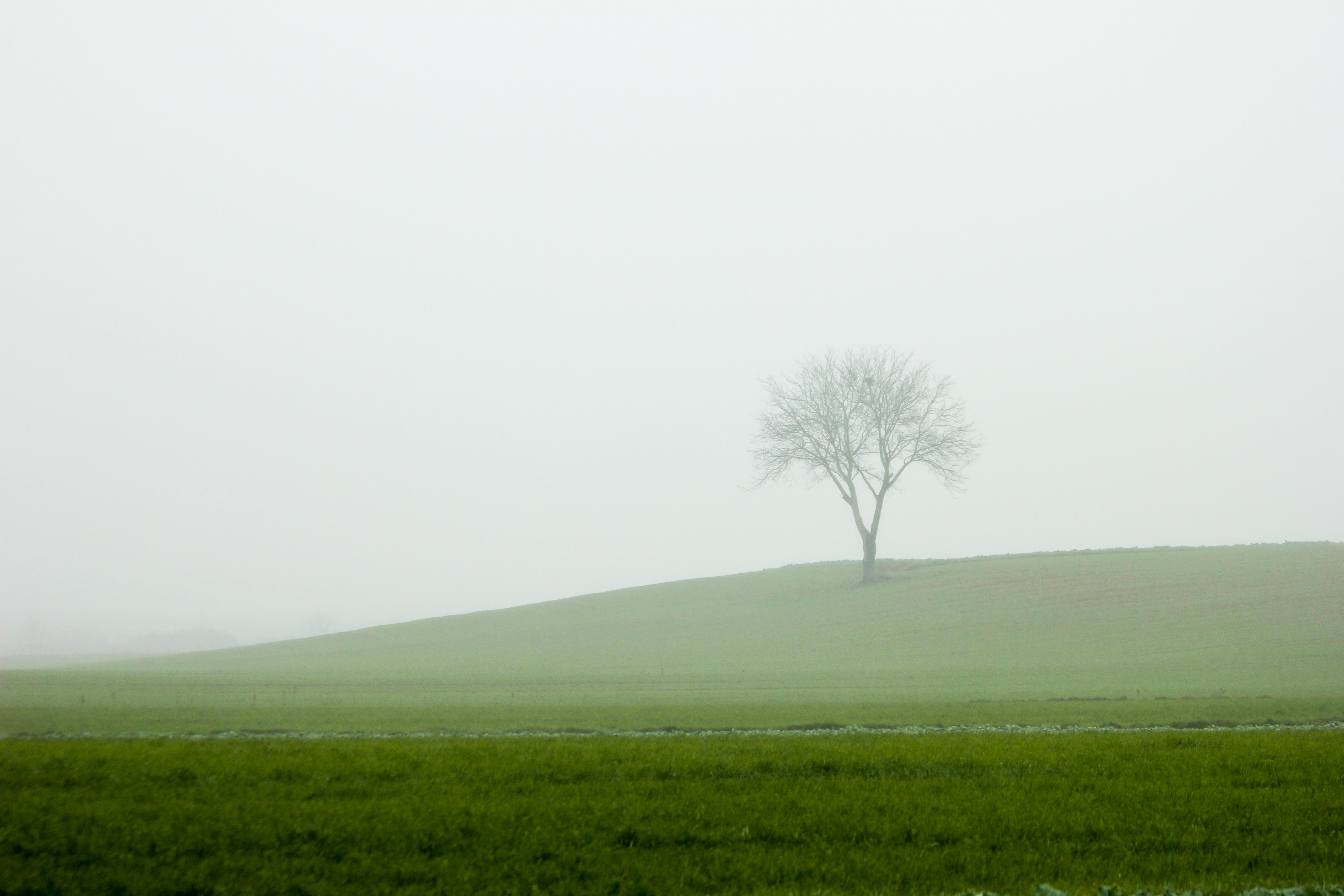 Tijekom šetnje maglovitog jesenskog jutra, naišao sam na osamljeno drvo na brdašcu prekrivenom tek izniklim vlatima zelene pšenice. Motiv usamljenog drva učinio mi se zanimljivim zbog kontrasta koji pruža drvo bez lišća, bez života i polja punog života - mladih klica pšenice intenzivne zelene boje. Htio sam i postići da magla cijeloj kompoziciji da mističan, tajnovit štih. Donji dio fotografije je tamniji, gornji izuzetno svijetao s prijelaznim slojevima i konturama koje daje magla. Fotografija je statična. Kadar sam odabrao tako da drvo bude smješteno desno od sredine, činilo mi se interesantnije za kompoziciju, a kako je i linija uspona brda prema drvu učinilo mi se da će privući pažnju prema drvu koji je glavni objekt ove minimalističke kompozicije.