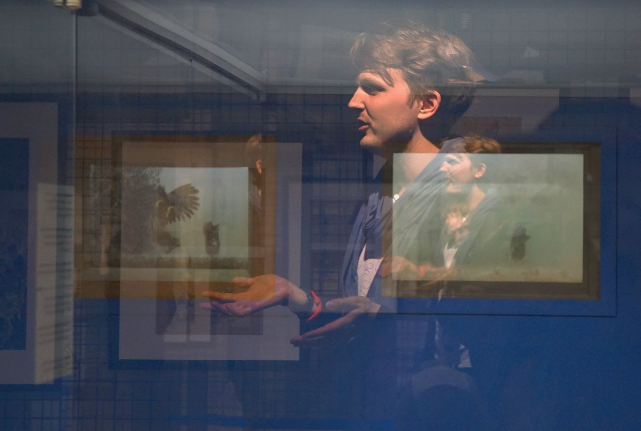Мне нравится необычный ракурс в этом портрете. Молодой историк российской анимации Павел Шведов ведёт кураторскую экскурсию по выставке, посвященной истории киностудии "Союзмультфильм". Я снимала его отражение в прозрачной витрине, сквозь которую просвечивают узнаваемые работы Юрия Норштейна -- панорамы к мультфильму "Ёжик в тумане". Портрет дробится в стекле, соединяется с картинами и создаёт ощущение метафизической связи произведений искусства и увлеченного молодого исследователя. Снимок сделан в условиях недостаточной освещенности, но, на мой взгляд, это пошло ему на пользу и он сложился в единую картину. SONY ILCE-5100, кроп 1,5, SEL 55-210, фокусное расстояние 55, ISO-3200, f/4,5, 1/80c.
