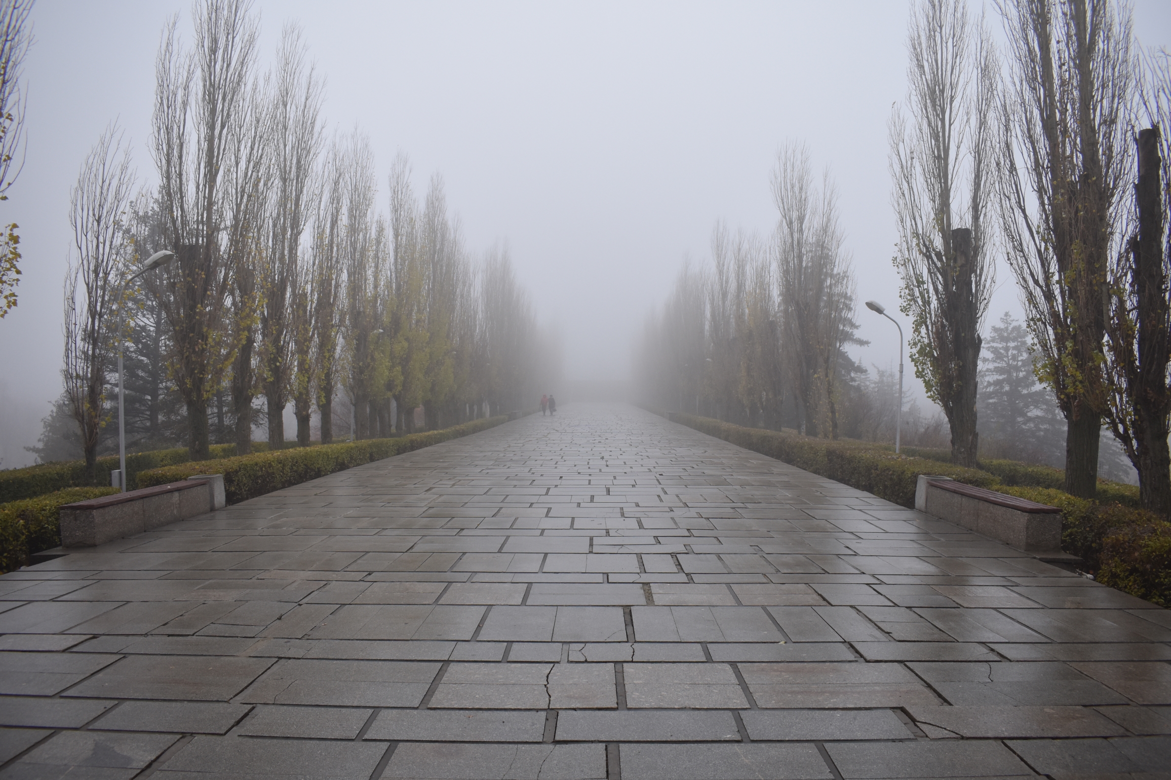 Очень хороший снимок у Вас получился. Нравится композиция кадра, его компоновка.Цвета в кадре естественные, не искаженные, свет распределен соответственно погодным условиям. туман создает характерную атмосферу, дорогая- линейную перспективу, а плитка- задает снимку ритм. Люди так же дополняют композицию, показывают масштаб