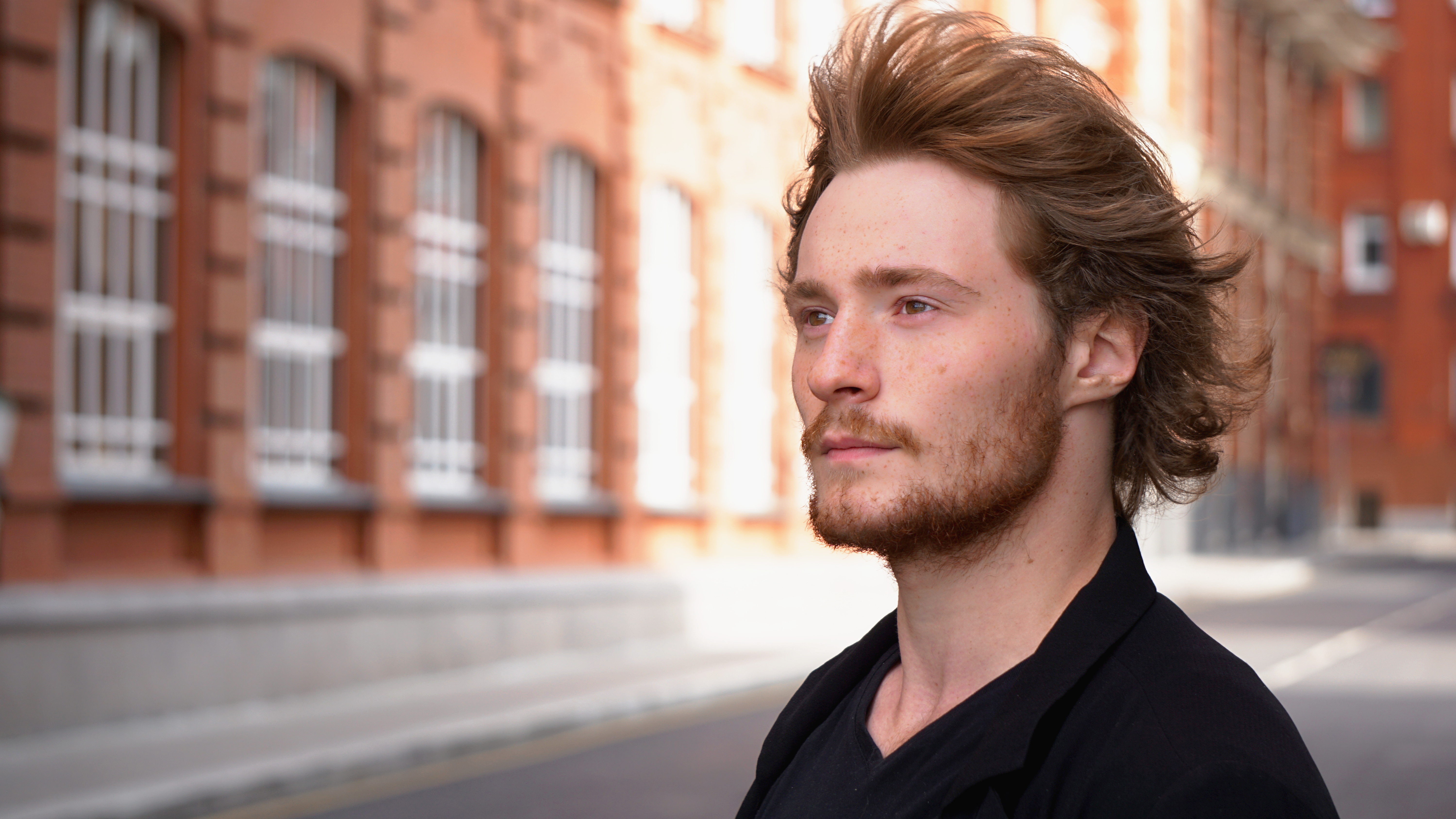 Мне кажется, что этот портрет снят по правилам: и правило третей тут есть, и ритм, и перспектива, и пространство для взгляда, и цвета сочетаются: рыжая шевелюра сочетается с терракотовым цветом кирпича, а чёрная одежда контрастирует с белыми переплётами окон. И ещё мне нравится, как лицо попало на светлый блик на стене.