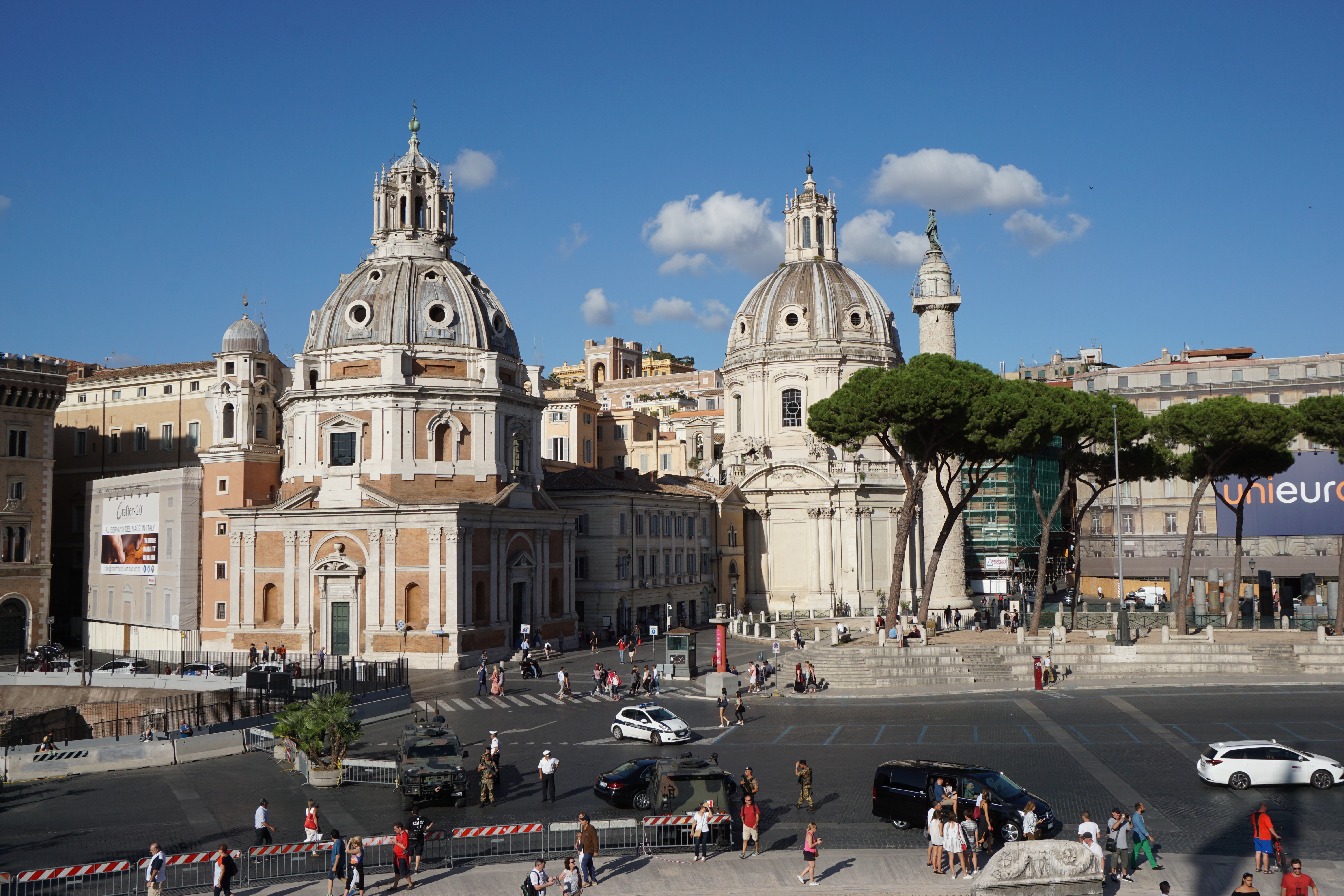 Сверху город выглядит уменьшенным , маленьким. Башни возвышаются над улицей, как два великана.