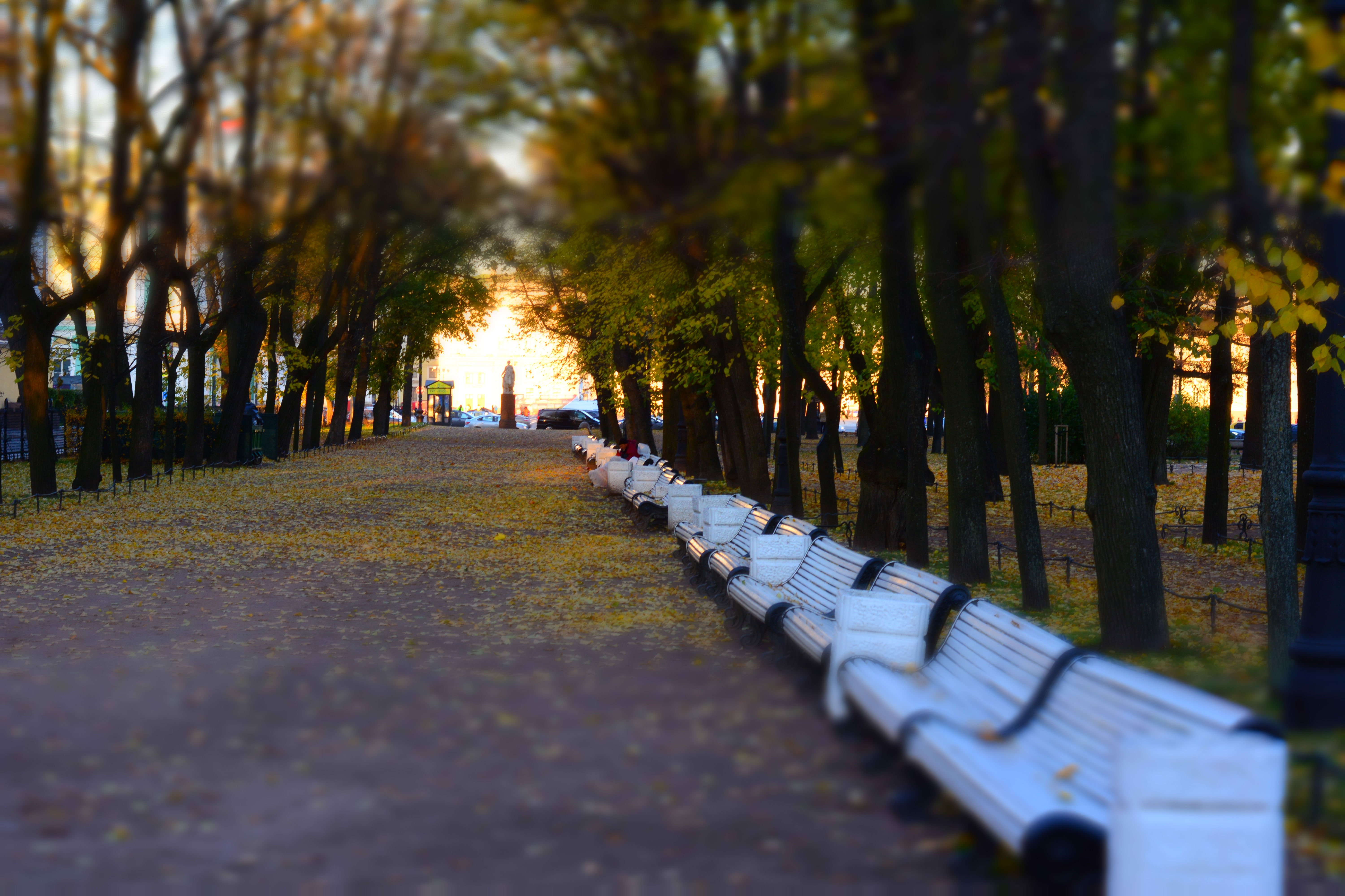 Настойки выставлены подходящие, именно для съёмки пейзажа. И место выбрано красивое, линия из лавочке удачно направляет взгляд зрителя в глубину кадра и развивает сюжет. Применив эффект миниатюры, вам удалось показать сюжет игрушечным) Смотрится здорово!