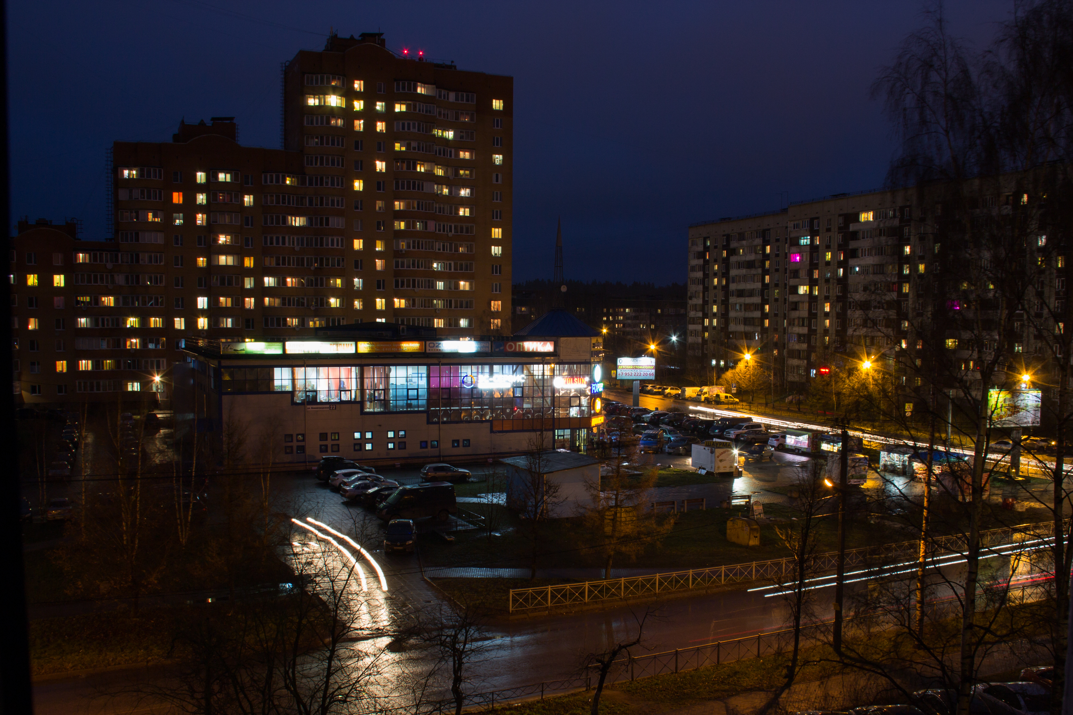 В это время года самые тёмные дни. Днём темно. Решил передать красоту вечерних огней. Для лучшей детализации выставил iso 100, чтобы улучшить чёткость всем предметам так же закрыл диафрагму до F/9.0, выдержка для лучшего экспонирования оказалась очень длинной - 8 сек. Соответственно снимать пришлось со штатива. Но появились оригинальные длинные следы от фар движущихся автомобилей, что придало динамику картинке.
