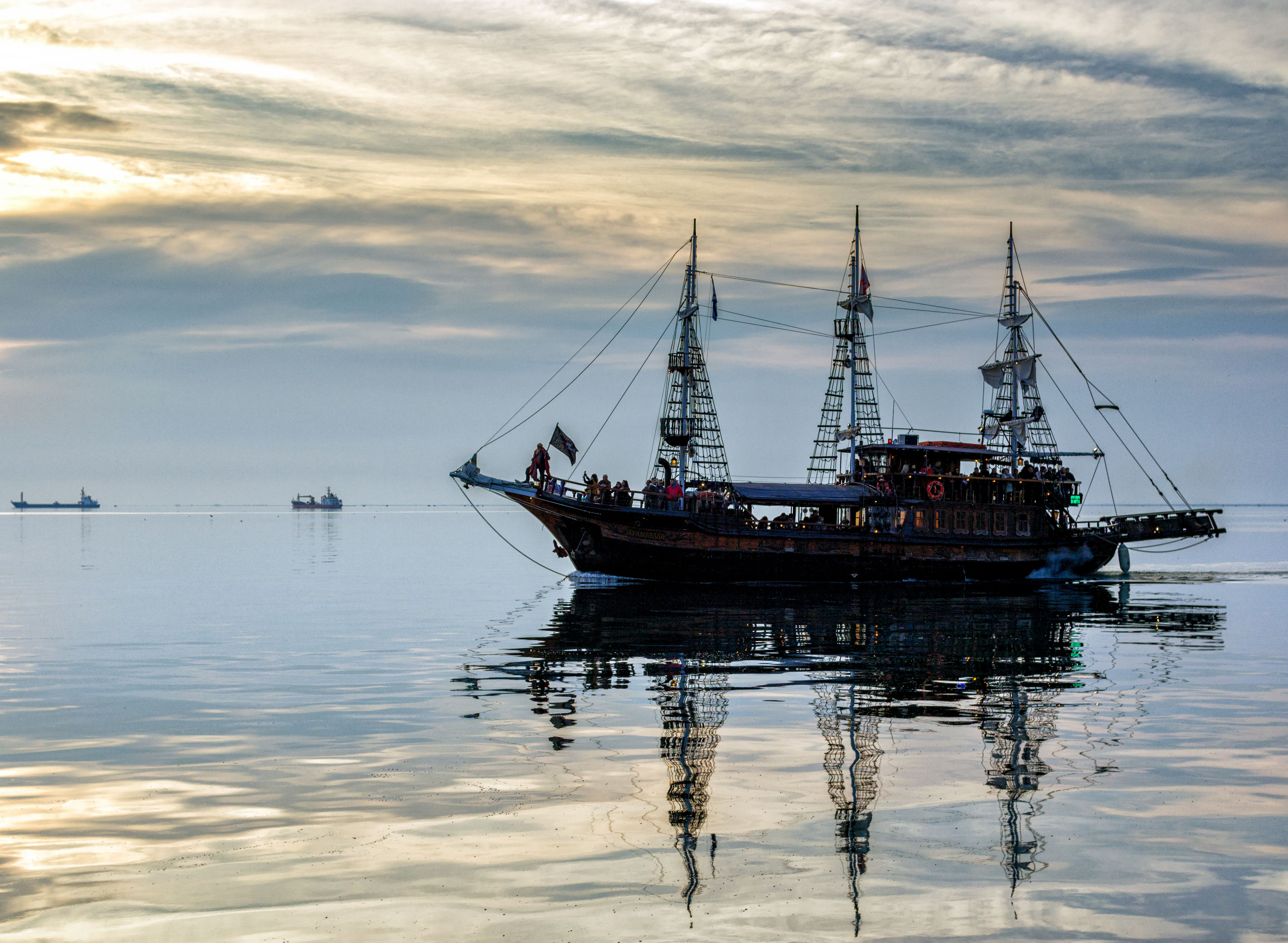 Совершенно верно, здесь отлично подходит горизонтальный формат, и пространства по направлению "движения" корабля оставили достаточно. Удачно использовали отражение, чтобы заполнить передний план.