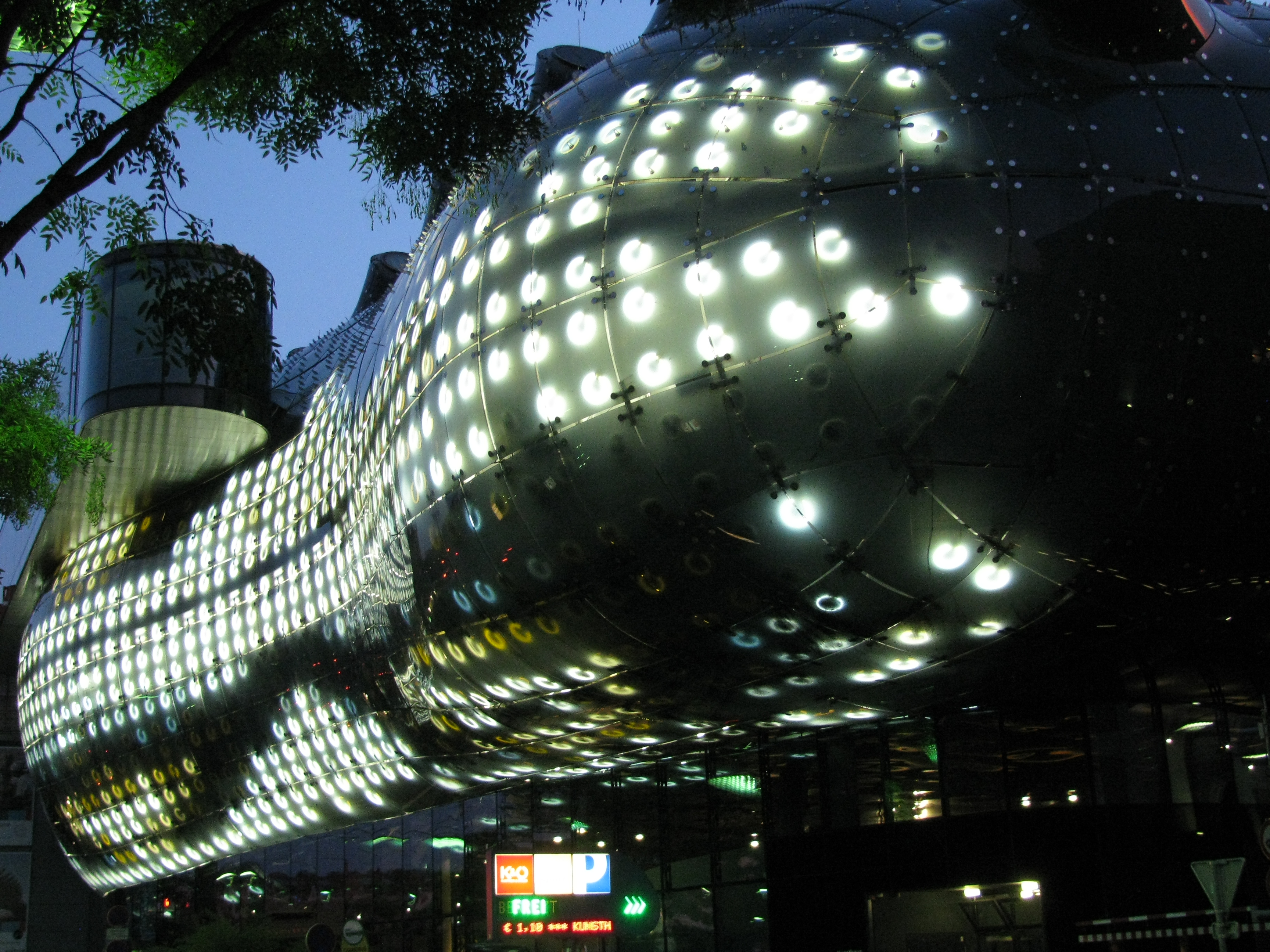 На снимке город Грац Кунстхаус Галерея современного искусства. Мы с мужем назвали это Наутилус. Сооружение просто фантастическое! Сначала рассматривали и фотографировали днем, потом вечером. Вариантов фоток было много. Далеко не все удачные. Я старалась! Как это можно было снять удачнее - хотелось бы узнать от Вас.